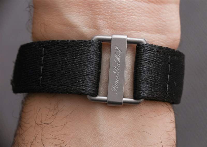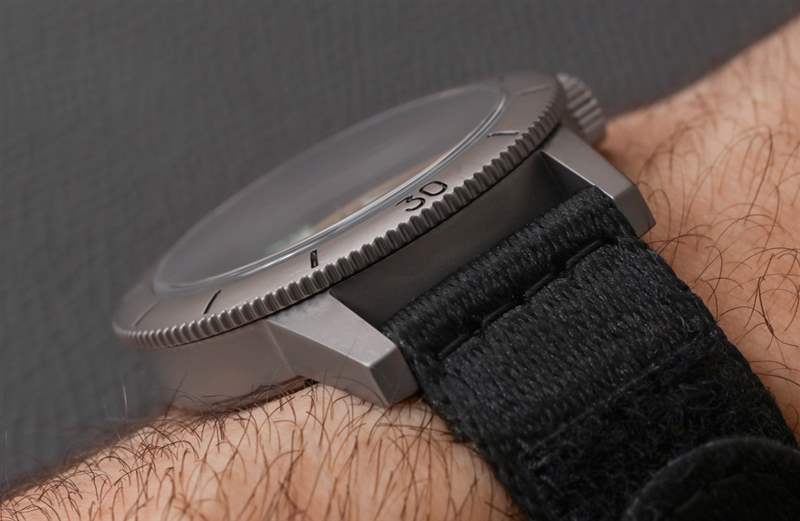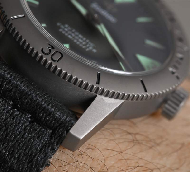 雖然略微圓頂?shù)乃{寶石水晶鏡面確實有點眩光,但 Super Sea Wolf 的整體易讀性非常好,在黑暗中看到帶電的夜光本身就是一種特別的享受。發(fā)光體的厚度和顏色等特征,以及指針和時標上細微的拉絲金屬表面表明,在這個價位的大多數(shù)其他工具手表中都缺少重要的細節(jié)水平。