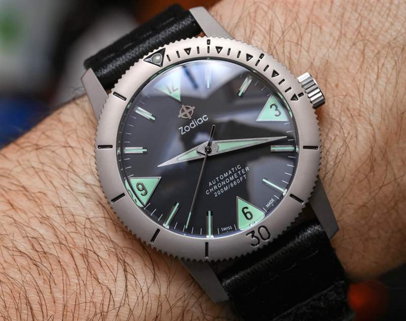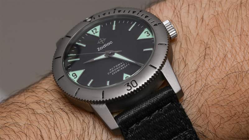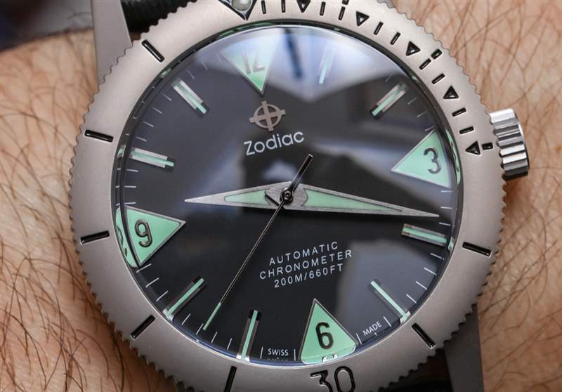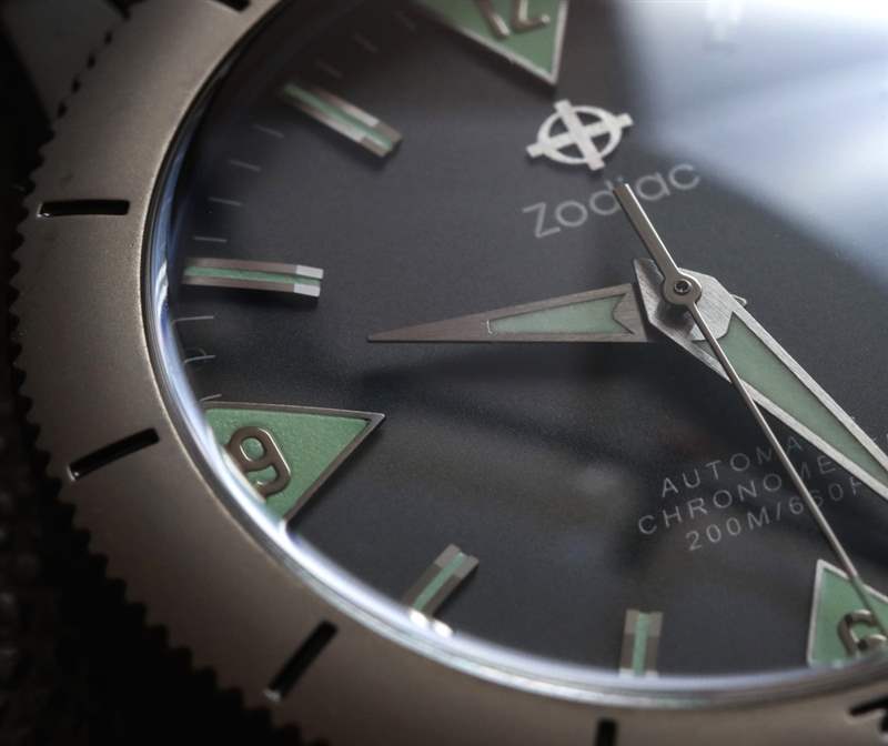 這種特殊的表盤風格從未像 Zodiac 那樣被模仿過,但您可以在許多 Eterna KonTiki 系列潛水表中看到它的標志。四個相對的三角形時標與太妃式指針一起使用,具有出色的易讀性和視覺效果。雖然這款限量版并不是唯一一款采用這種表盤風格的手表,但 Zodiac 確實為這款限量版清理了它——我認為結果非常好。限量版表盤的主要優(yōu)點之一是沒有日期窗口,因此 3 點鐘位置指示器取代了窗口,從而使表盤布局在視覺上更加對稱,從而令人賞心悅目。