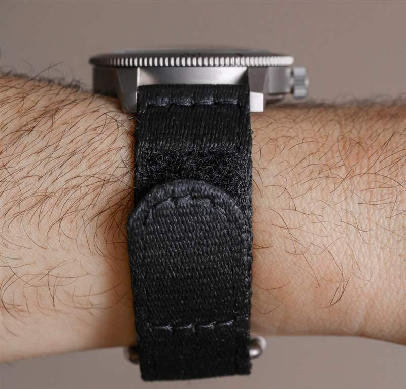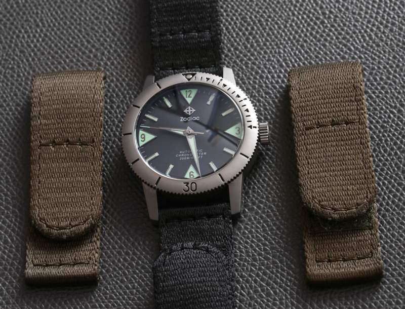 Zodiac 選擇為這款限量版 ZO9205 測試一條有趣的表帶,他們實際上包括兩種顏色:黑色和橄欖綠。織物帶的兩端都有魔術貼,以便更精確地貼合。一端塞入表帶下方,另一端塞入表帶,位于手表的“手腕內側”一側。金屬扣用作兩個帶子末端的環(huán)以連接。更重要的是,這不是北約風格的表帶,這意味著表殼底部沒有增加厚度,因為表帶沿其長度延伸。這意味著您可以擁有這款表帶有趣和舒適的外觀(非常適合體育活動)和低調的坐姿,而其他版本的 Super Sea Wolf 53 也可以在金屬表鏈上使用。