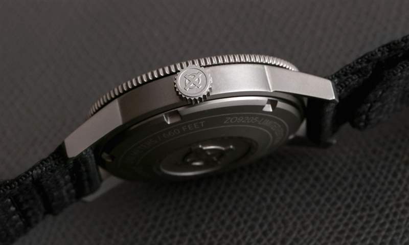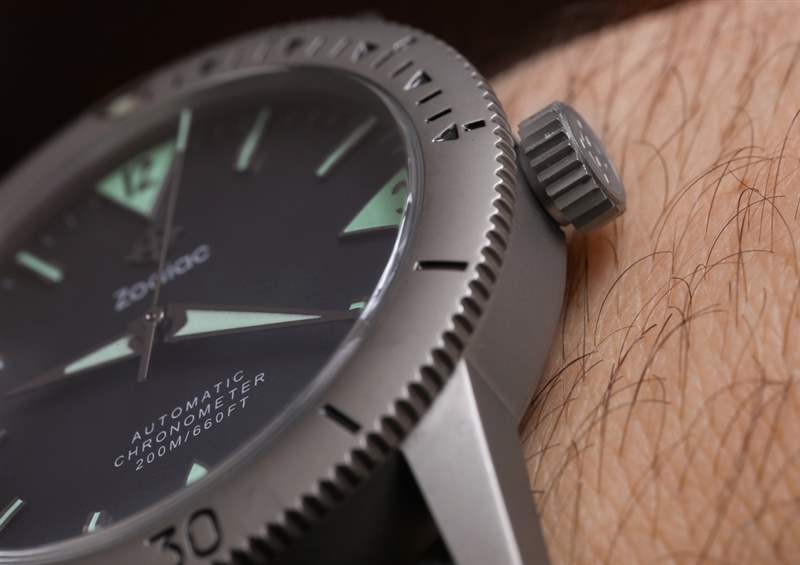 與其他 Zodiac Super Sea Wolf 53 型號的鋼相比,深灰色表殼是鈦金屬。請注意,這款限量版 ZO9205 去掉了名稱中的“53”部分。由于重量較輕,鈦金屬使這款尺寸適中的手表佩戴起來更加舒適——這是顯而易見的。表殼防水深度達 200 米,帶有旋入式表冠,單向表圈牢固地咔噠一聲,沒有任何明顯的擺動。