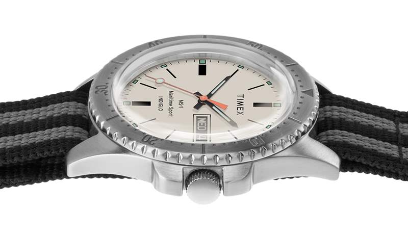 MS1 Maritime Sport 腕表采用 41 毫米寬的精鋼材質(zhì)。黑色表盤搭配黑色精鋼表殼,而銀色表盤搭配天然精鋼表殼。兩者都有旋轉(zhuǎn)潛水表圈。這些手表是運(yùn)動型的,但不一定可以潛水,只有 30m 的防水深度。然而,它們確實(shí)具有 Timex 有用的 INDIGLO 表盤背光照明系統(tǒng)(通過按下表冠激活)。MS1 Maritime Sport 手表內(nèi)部是 Timex 石英機(jī)芯,帶有時間、星期幾和日期。