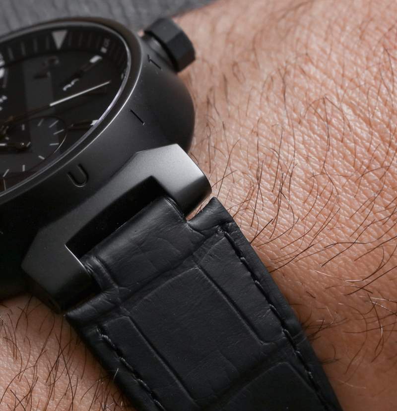 如果您想要更大的表殼佩戴體驗(yàn),Tambour All Black Chronographe 采用 46 毫米寬的表殼(確實(shí)感覺(jué)更大)。對(duì)我來(lái)說(shuō),Tambour 的理想表殼尺寸仍然是 44 毫米寬。All Black 精鋼表殼的啞光黑色飾面做得很好,并使用 PVD ??應(yīng)用工藝進(jìn)行應(yīng)用。表帶扣是 DLC 涂層的黑色,這可能是一件好事,因?yàn)樗峁┝烁嗟哪湍バ裕鴰Э弁鶗?huì)導(dǎo)致鐘表的大部分磨損。