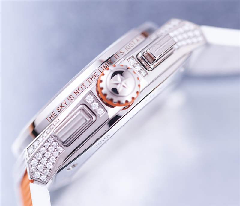 44 毫米寬的 18k 白金鑲有高雅的鉆石,這正是 Swizz Beatz 想要這款腕表的裝扮。當鉆石成為桌面上的一種選擇時,真的很難說不。我個人喜歡鑲嵌在表殼中的圓形切割寶石(其中 288 顆,約 2.55 克拉)與鑲嵌在表圈中的更大(更陽剛)長方形切割鉆石(其中 44 顆,約 2.46 克拉)的組合。與表盤上的橙色強調色相匹配的是帶有橙色織物襯里的白色橡膠表帶。Swizz Beatz 認為橙色是他最喜歡的顏色之一,更重要的是,他在心情愉悅時首選佩戴諸如此類的彩色時計。