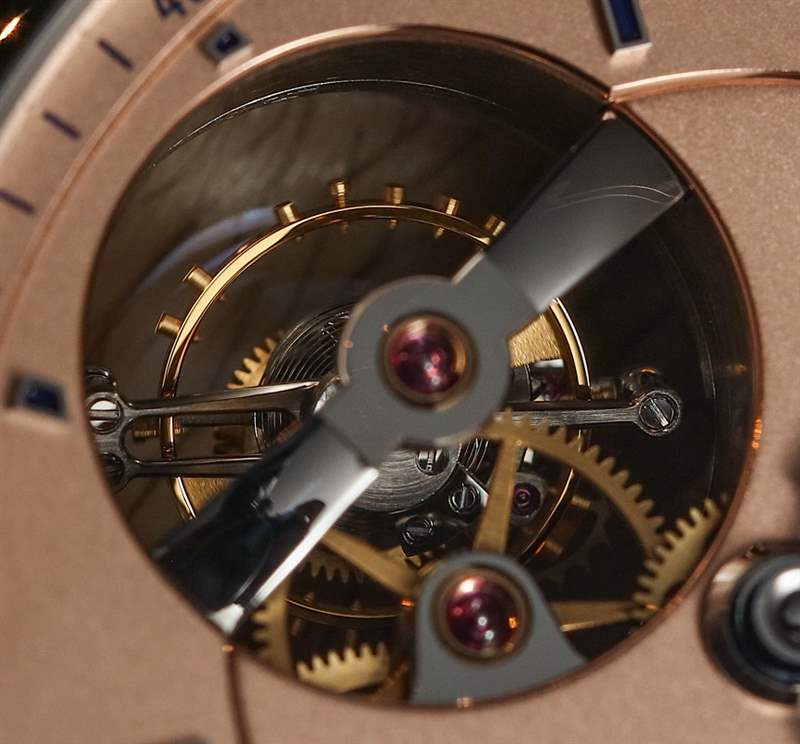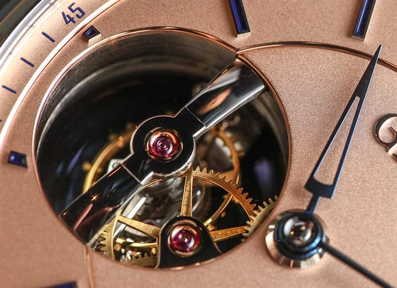 機芯本身——由高珀富斯內部設計、生產和裝飾——由 293 個零件制成,僅陀飛輪組件就有 86 個零件。這個運動完全是關于美學和藝術技巧的。在性能方面,它通過輔助秒針盤、基于陀飛輪的調節系統以及在手表運動側可見的動力儲存指示器提供時間。