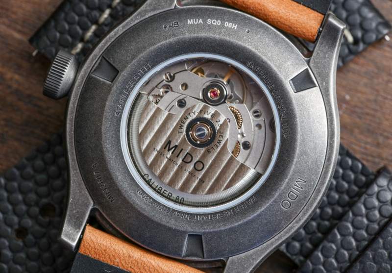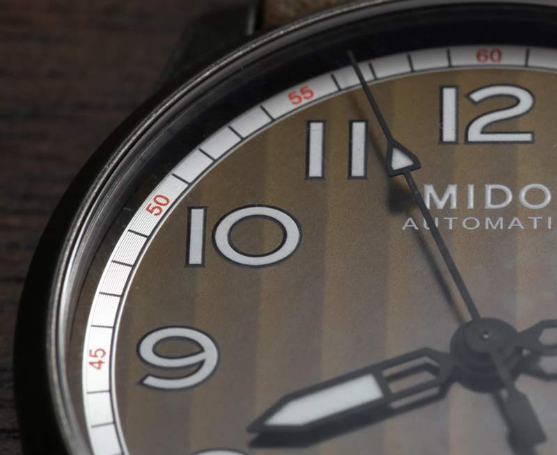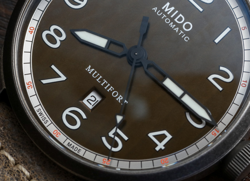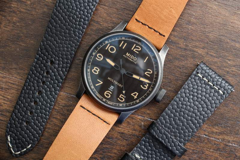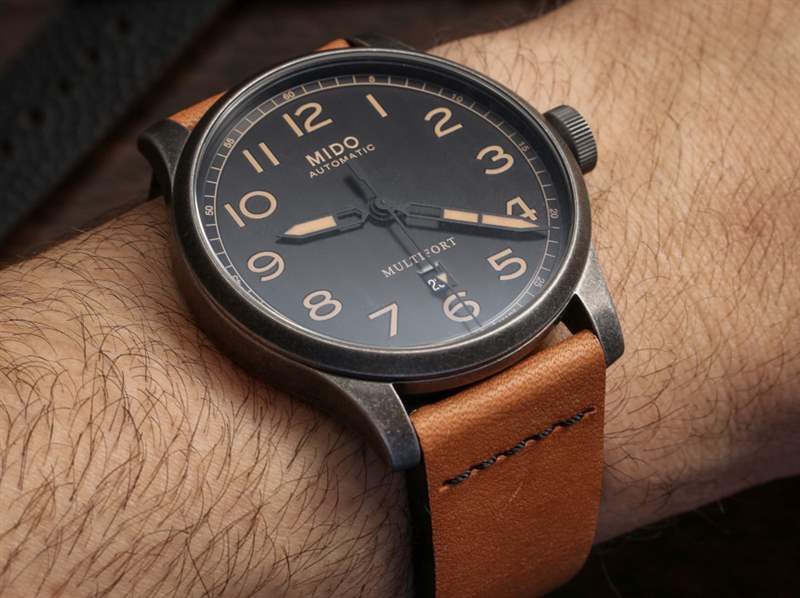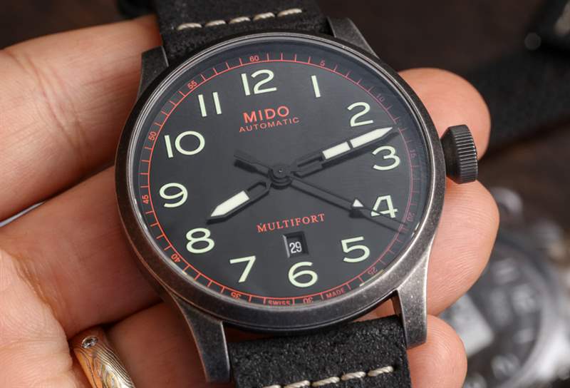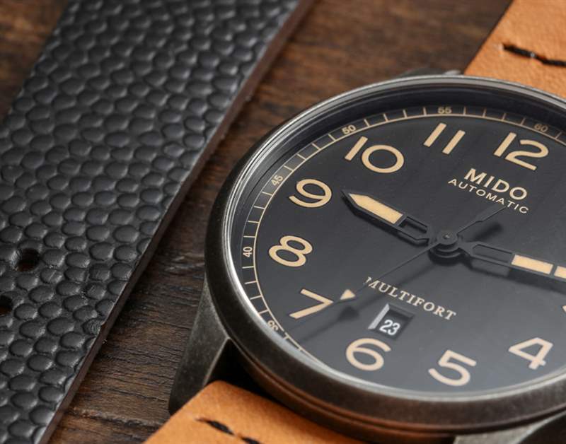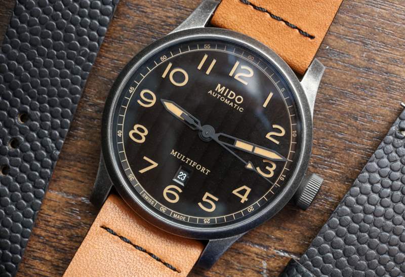 44 毫米寬,這是市面上較大的 Multifort 三針手表之一,但由于其主要是復古外觀,大表殼尺寸比“太大”更有趣和時尚。表殼表面處理類似于槍色金屬,但略有不同。Mido 顯然是在追求一種陳舊的外觀,試圖發揮這樣一種觀念,即某些經典手表設計在以“陳舊風格”呈現時也看起來很酷。是的,這是純粹的時尚,但手表確實提供了經典手表的吸引力,非常注重現代時尚的考慮。