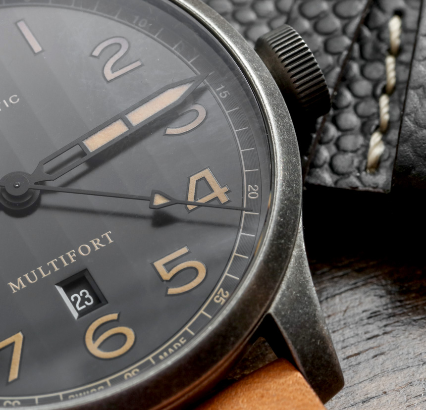 許多 Multifort 手表共有的吸引人的設計元素之一是表盤上的 C?tes de Genève 風格(拋光條紋)裝飾,以垂直條紋的形式出現。日內瓦條紋是機械機芯表面的一種常見裝飾形式。在表盤上看到這一點的情況要少得多。美度不久前決定在 Multifort 手表的表盤上使用垂直日內瓦風格的條紋,我認為它繼續運作良好。這與非常容易看到的 lume 繪制的阿拉伯小時數字和指針相結合,使表盤具有吸引力且非常清晰。我也喜歡時針與分針略有不同,從而進一步強調了易讀性。