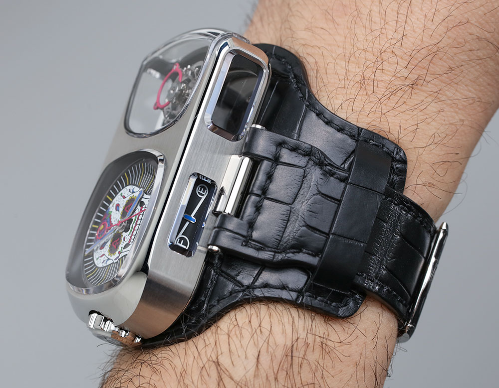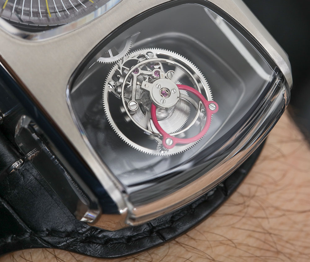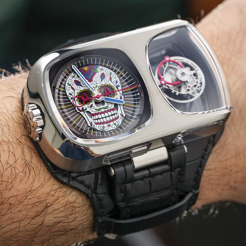 為了與 Calavera 頭骨的紫色、藍(lán)色和綠色相得益彰,飛行陀飛輪組件的一部分被涂成洋紅色?!半妱?dòng)剃須刀形”精鋼表殼除了在這些區(qū)域和手表的指示器(指針)上進(jìn)行了彩色處理外,大部分色調(diào)都比較樸素。顏色令人驚嘆,細(xì)節(jié)也是如此。這是一個(gè)奇妙的色調(diào)和線條組合。盡管我認(rèn)為手表的概念非常愚蠢,但我確實(shí)喜歡它戴在手腕上的感覺??ɡS拉萬歲!