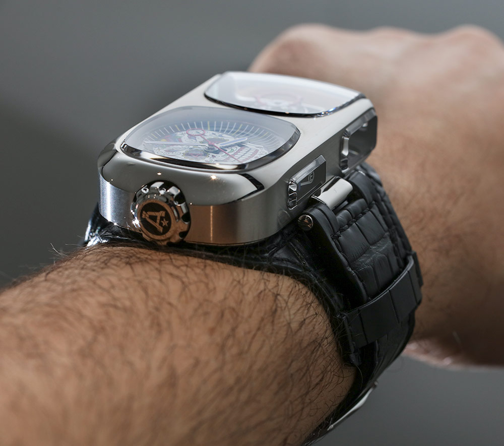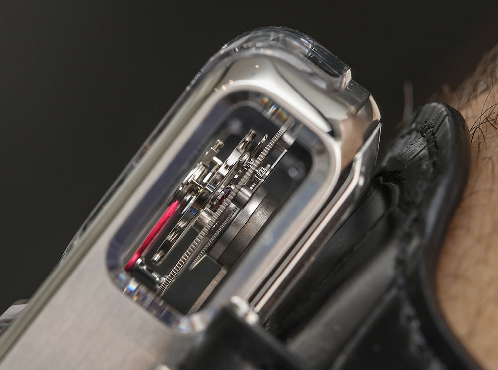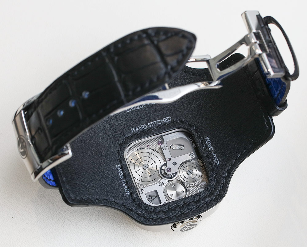 在手腕上,Angelus U10 Tourbillon Lumiere 在佩戴時(shí)總是比其笨拙的表殼形狀所暗示的更舒適。在全新的外灘款式表帶上,U10 Calavera 的佩戴更加出色。表殼寬 62.75 毫米,高 38 毫米。它也是 15mm 厚,防水深度為 30m。表殼周圍的所有藍(lán)寶石水晶有助于您看到表盤和機(jī)芯的重要部分。這包括側(cè)面安裝的動(dòng)力儲(chǔ)存指示器——我一直認(rèn)為它的執(zhí)行非常優(yōu)雅。