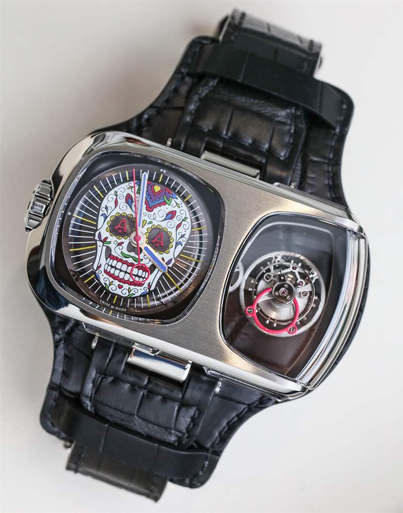Angelus U10 Tourbillon Calavera 參考 0LUAS.B01A.C001F 是一款完全獨(dú)特的作品,這意味著已經(jīng)非常罕見的Angelus U10 Tourbillon Lumiere 的這些版本中只有一個(gè)(在這里動(dòng)手)。這款手表采用了非常奇怪(但以一種很酷的方式)的 U10 陀飛輪,并對其進(jìn)行了一些外觀上的改變——最引人注目的是墨西哥亡靈節(jié)“卡拉維拉”彩繪骷髏和外灘式表帶。