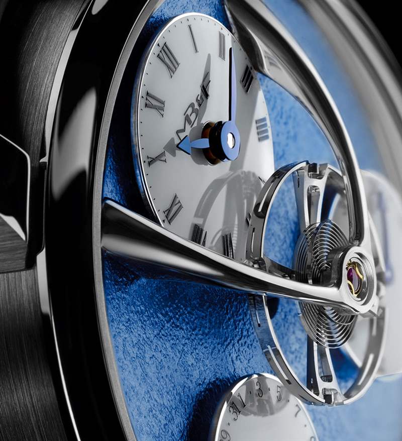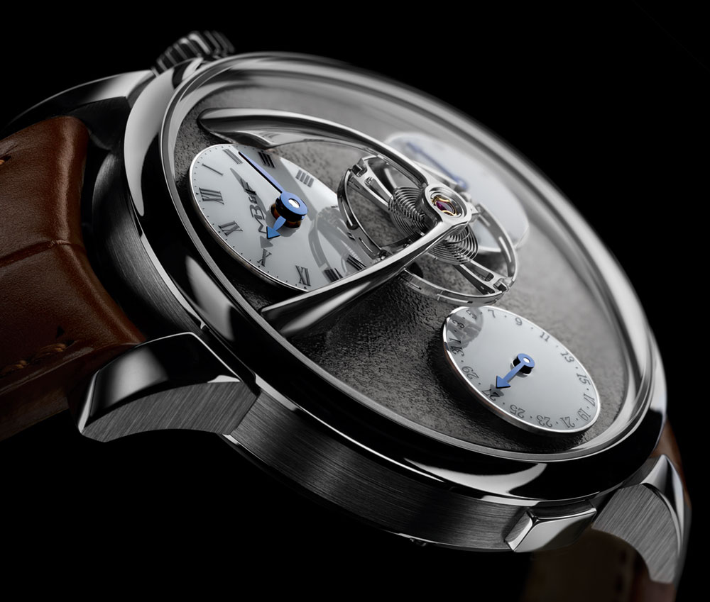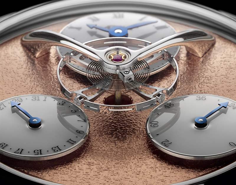 Legacy Machine 分體式擒縱系統受益于對 Legacy Machine 的美學升級,后者最近才推出,并且在 LM1 的生產運行后期。這包括拋光表圈以及平衡輪橋的圓形和拋光設計。MB&F 進一步選擇將他們精美的“磨砂”表盤用于這些首次亮相的 Legacy Machine Split Escapement 手表。這是我們之前在LM101 Frost 中看到的技術(此處為動手)。磨砂面為主表盤上的三個子表盤以及懸掛的 2.5Hz 頻率擺輪機構提供了迷人的背景。