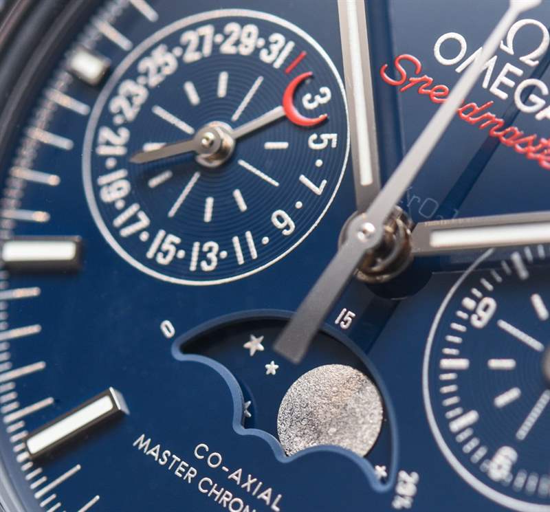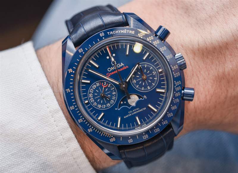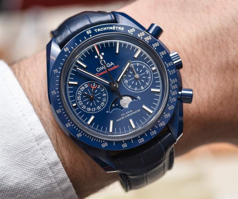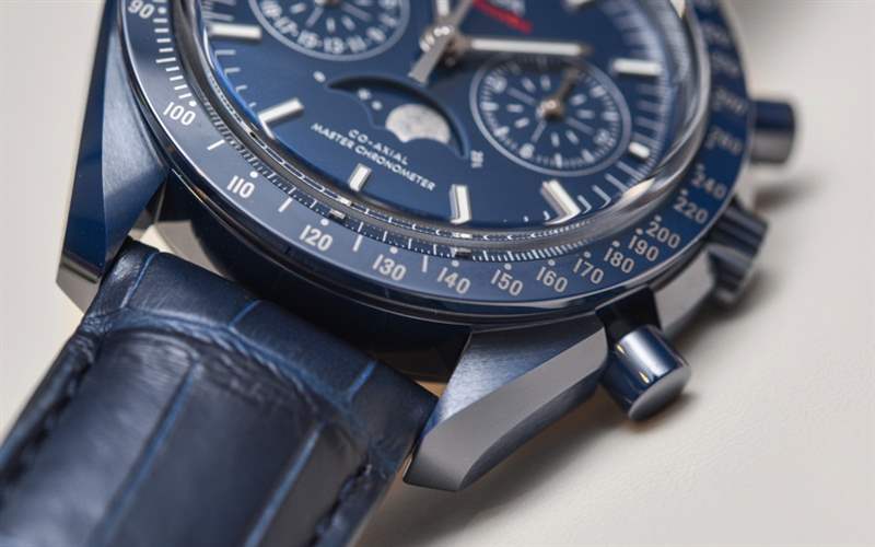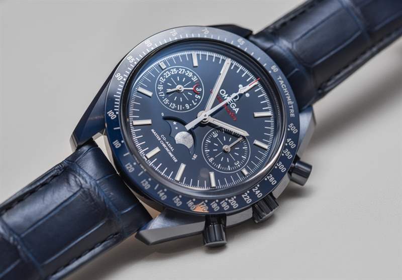 自從最初的 Speedmaster Dark Side Of The Moon(帶有性感的黑色陶瓷表殼)幾年前在 Baselworld 引起轟動以來, “月亮的(顏色)面”已經成為歐米茄的流行語。歐米茄熱切地嘗試通過一系列不同的設計來保持彩色陶瓷表殼的趨勢。甚至 Seamaster Planet Ocean 潛水表也有黑色或藍色陶瓷表殼可供選擇。歐米茄 Speedmaster Blue Side Of The Moon 是 2017 年最新推出的陶瓷超霸腕表——實際上也是唯一一款全新的陶瓷腕表。根據典型的歐米茄慣例,手表的官方(全名)名稱是歐米茄超霸藍色月球同軸主計時計時碼表月相。