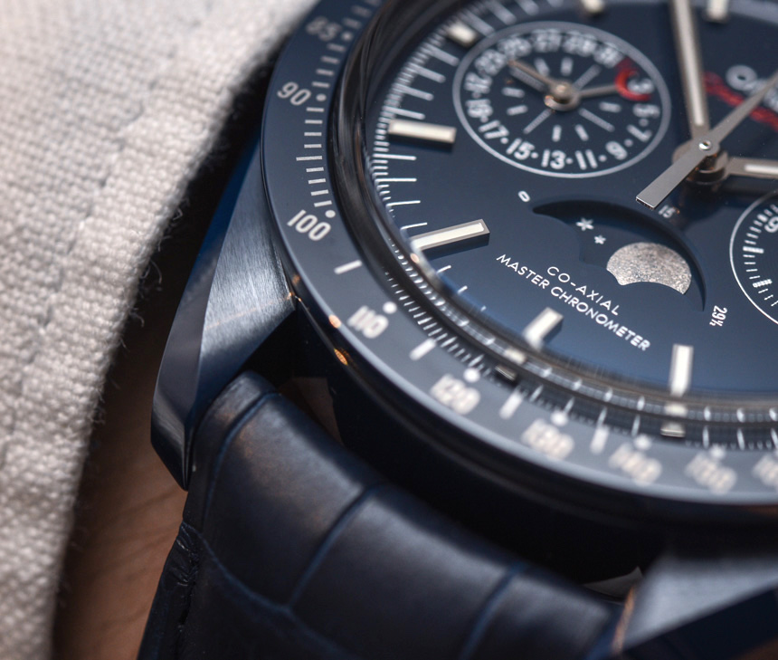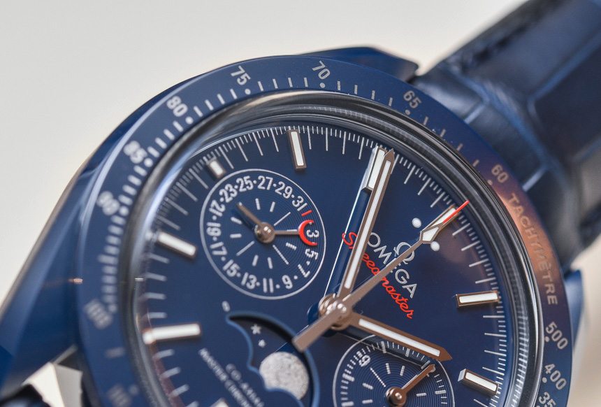 還要記住,藍色表盤和表圈樣式在月球 Speedmaster Moonphase 的藍色側面與我之前評論并鏈接到上面的鋼殼表盤不同。精鋼款的表盤是拋光的太陽紋金屬藍色,而這款表款的藍色陶瓷表盤則呈現出更啞光的深藍色。我個人認為,月之藍方將是大多數人更喜歡的版本——當試圖弄清楚要獲得什么藍色 Speedmaster 時。