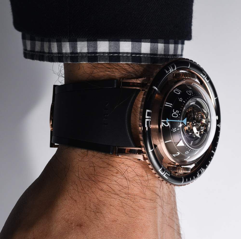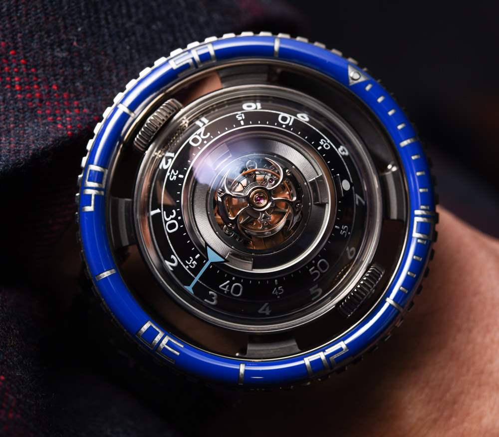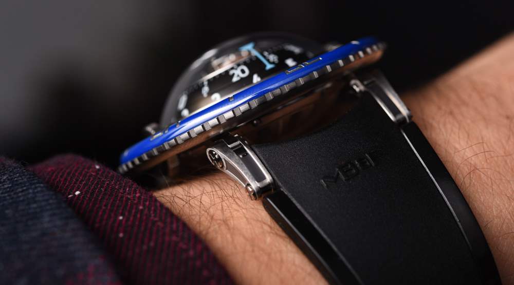 您越仔細(xì)觀察旋轉(zhuǎn)表圈和顯示時(shí)間的旋轉(zhuǎn)環(huán),您就越能意識(shí)到對(duì)傳統(tǒng)潛水表的所有微妙點(diǎn)頭——比如勞力士潛航者,但不僅限于此。使用的字體是 MB&F 獨(dú)有的,但你可以看出數(shù)字布局和設(shè)計(jì)的靈感完全來自于多年來欣賞潛水表外觀和感覺的人。甚至分鐘環(huán)上的 60 分鐘指示器也是一個(gè)帶有夜光點(diǎn)的應(yīng)用三角形,您可以在許多嚴(yán)肅的潛水時(shí)計(jì)的表圈上找到這種風(fēng)格。