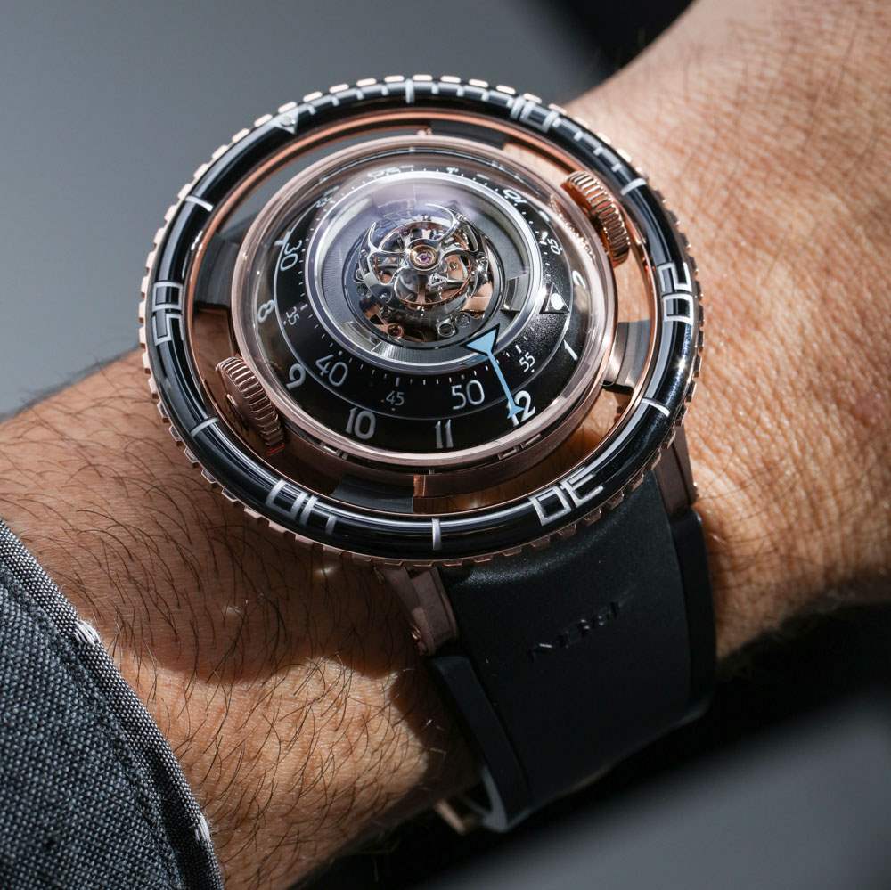 話雖如此,我認(rèn)為正是因?yàn)槲蚁矚g潛水表(和 MB&F),MB&F HM7 Aquapod 才像它一樣吸引我。我通常相信 Max Busser 和 Eric Giroud(實(shí)際設(shè)計(jì)師)的設(shè)計(jì)敏感性,所以 MB&F HM7 Aquapod 所做的就是結(jié)合了至少兩件我熱愛的事情。它在視覺上也很狂野,包括一個(gè)內(nèi)部球形表殼和一個(gè)飛行陀飛輪,立即由多個(gè)指示時(shí)間的角度環(huán)構(gòu)成,以及一個(gè)旋轉(zhuǎn)潛水員風(fēng)格的金屬和陶瓷計(jì)時(shí)表圈,感覺就像 MB&F 對(duì)勞力士 Submariner 的致敬。