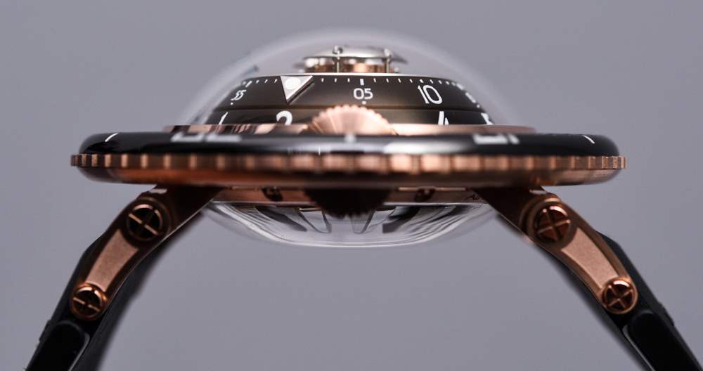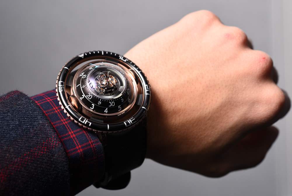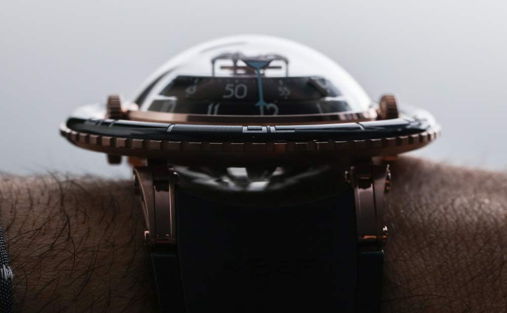 從側(cè)面看,MB&F HM7 Aquapod 看起來很像 1950 年代或 1960 年代的 UFO 概念,這直接體現(xiàn)了 MB&F 對(duì)科幻主題的持久熱愛與鐘表優(yōu)雅相結(jié)合。盡管表殼相當(dāng)大,寬 53.8 毫米,厚 21.3 毫米,但大部分重量實(shí)際上都位于您的手腕上方,因此非常舒適。此外,高端橡膠表帶非常舒適(而且看起來很整潔),并且可以舒適地佩戴在手腕上。在為 MB&F 之類的東西支付大筆費(fèi)用時(shí),您肯定知道自己在投資設(shè)計(jì)和人體工程學(xué)——認(rèn)真。