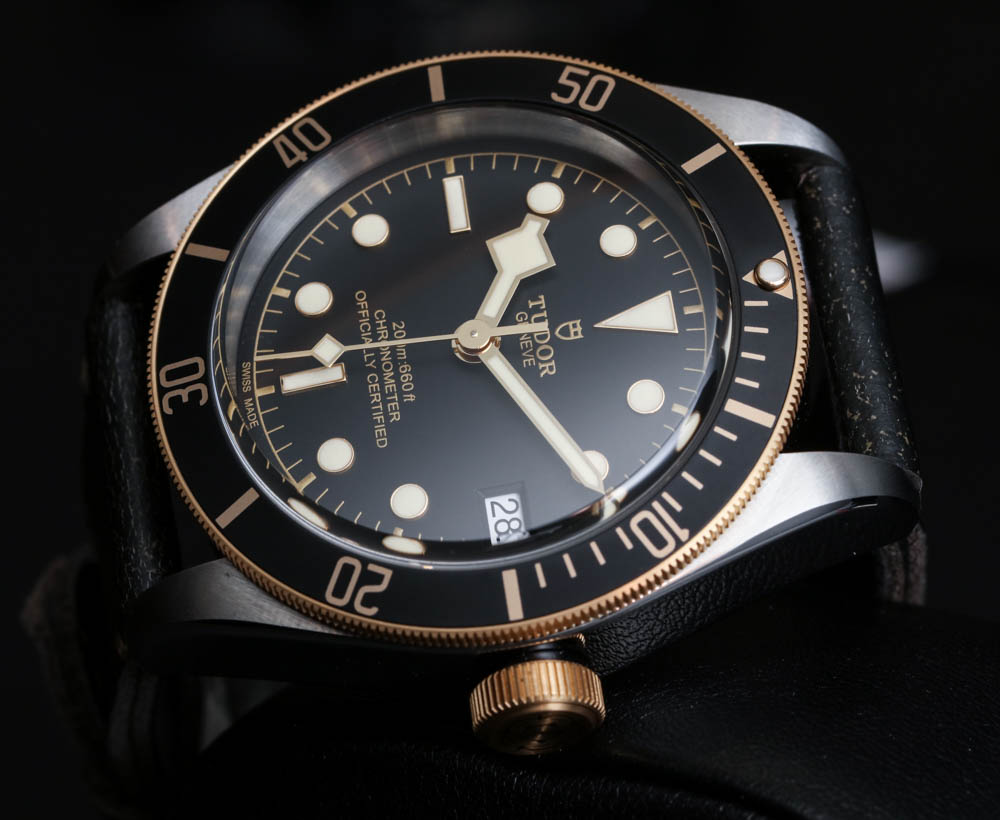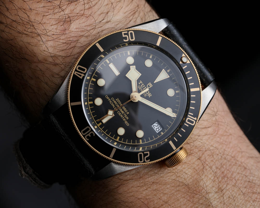 表圈周圍的表殼和表冠也使用了黃金。表圈文字以及表盤上的指針和時標使用了更多的金色。如果您喜歡雙色經典潛水表的外觀,并且買不起 10,000 美元以上的勞力士 Submariner 型號,那么 Tudor Heritage Black Bay S&G 將是您的最佳選擇。在我看來,這樣的雙色外觀(尤其是黑色表盤)非常帥氣和陽剛,但也提供了可喜的閃光度。不,它不適合每個人,但我碰巧非常喜歡它。