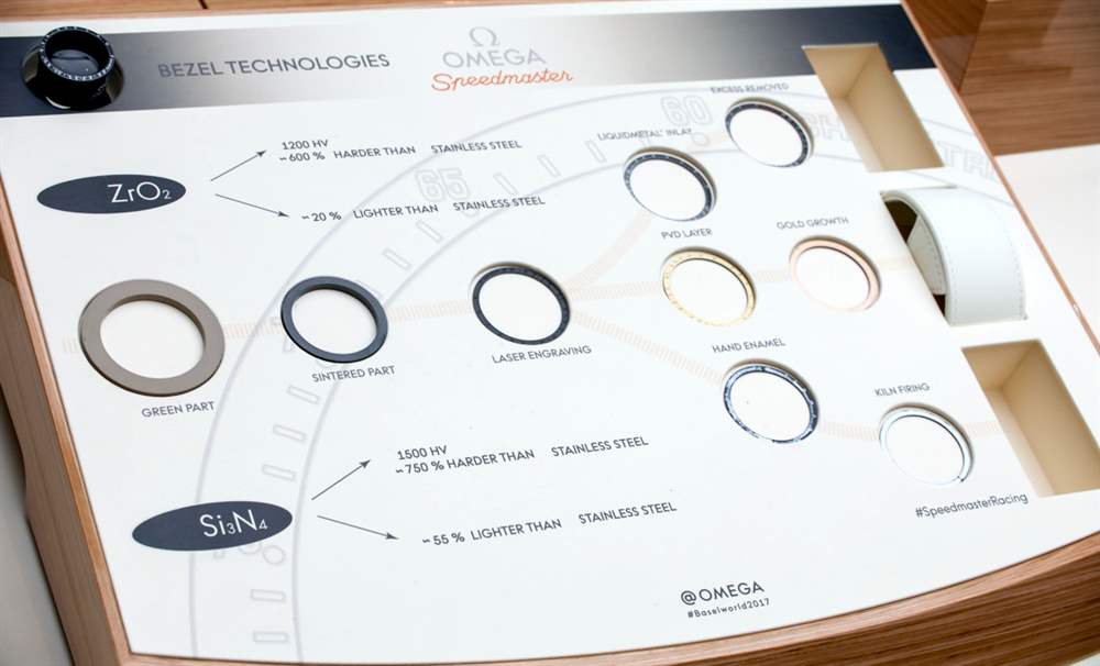 我提到邊框是新的。有兩種類型的邊框材料,陶瓷或氮化硅(取決于顏色,因?yàn)楹笠环N材料用于灰色邊框)。然后,歐米茄使用液態(tài)金屬、Ceragold 或搪瓷作為測(cè)速儀表圈標(biāo)記和文字。對(duì)我來(lái)說(shuō)最有趣的是帶有白色琺瑯的黑色陶瓷表圈。后者用于白色表盤版本的表圈文字,因?yàn)榘咨淖中枰髁痢⒂谰玫念伾珌?lái)匹配表盤。對(duì)我來(lái)說(shuō),這些是最有趣的表盤(白色和黑圈子表盤),根據(jù)歐米茄的說(shuō)法,每個(gè)烤琺瑯表圈都有五層琺瑯。