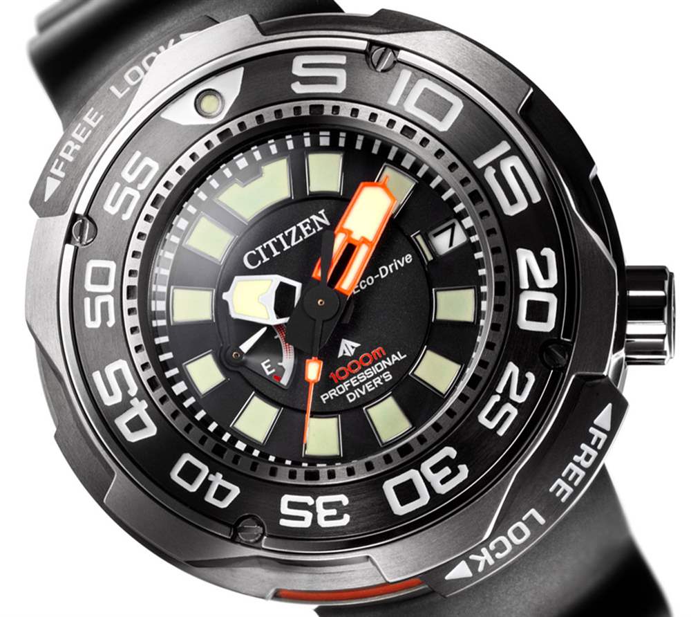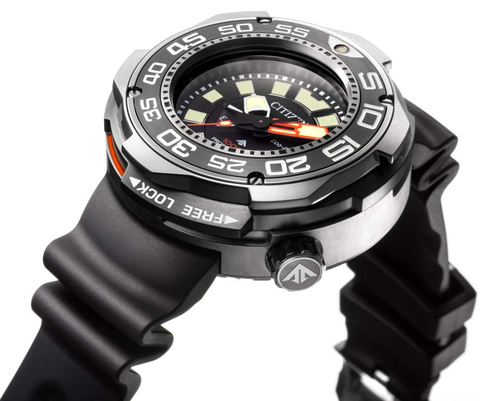 該品牌引以為豪的 Citizen Promaster Eco-Drive Professional Diver 1000m 至少有兩項創新。首先是用于旋轉潛水員表圈的新型扭鎖機制。這以圍繞表圈的極其明顯的環的形式出現,通過扭轉來鎖定或釋放旋轉 60 分鐘潛水員風格旋轉計時表圈的能力。當表圈解鎖或表冠旋下時,用戶可以看到橙色部分,這是“不安全”警告。