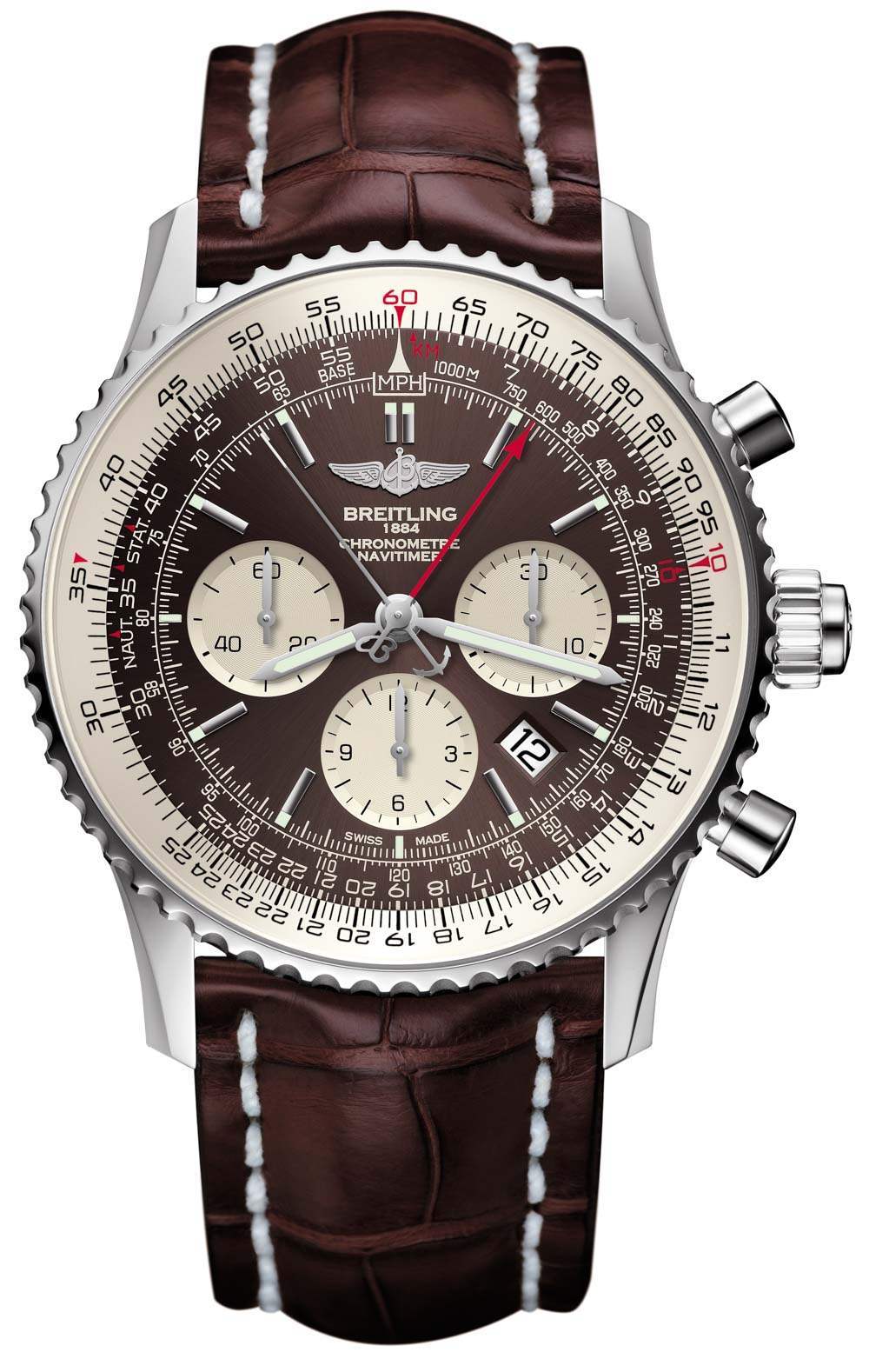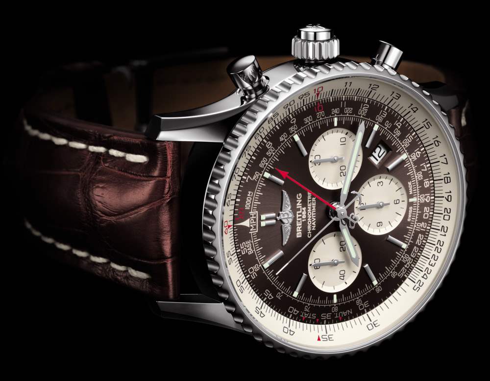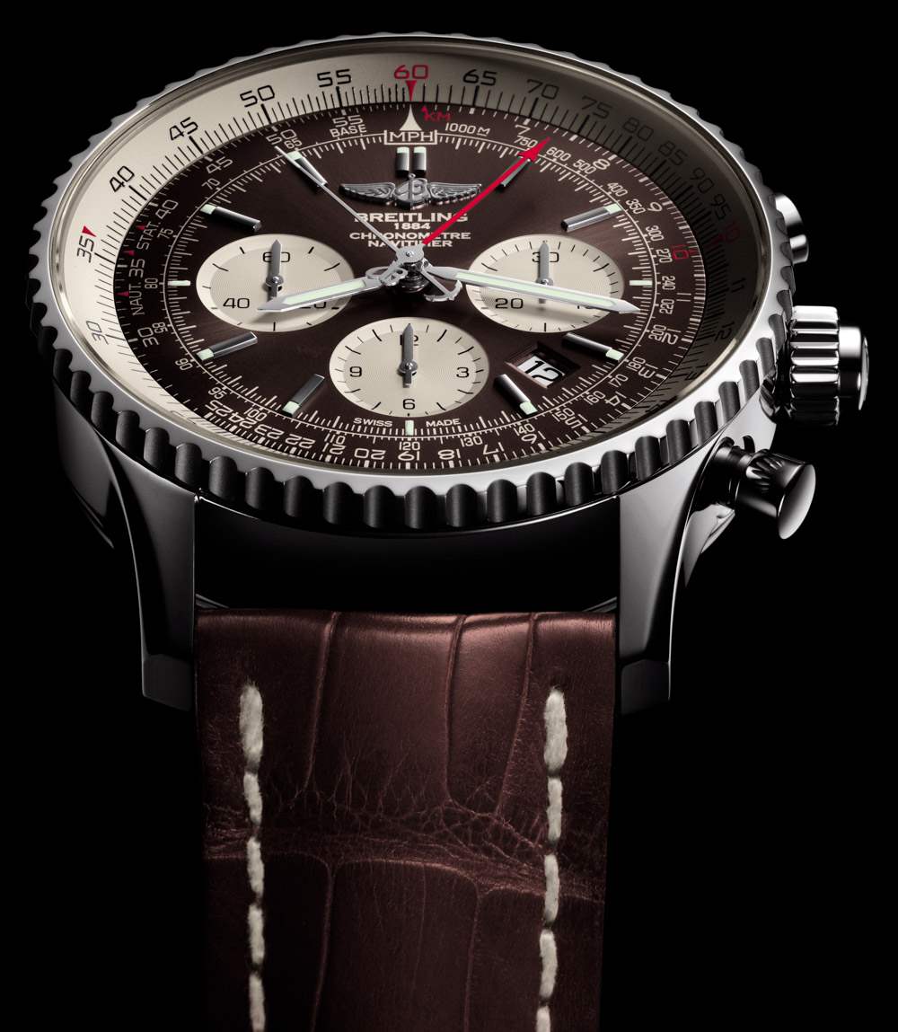 為了推出 B03 機芯,百年靈選擇了 45 毫米寬的航空計時腕表,棕色表盤采用兩種表殼材料:精鋼和 18 克拉紅金作為限量版。棕色表盤(百年靈實際上稱它們為“巴拿馬青銅”)與帶襯墊的棕色鱷魚皮表帶相匹配。雖然百年靈也將在皮革或橡膠表帶上提供 Navitimer Rattrapante。