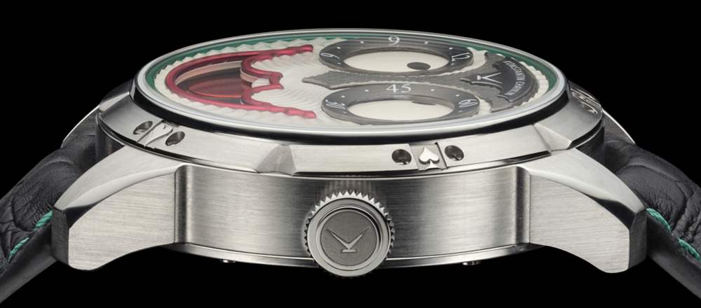 Konstantin Chaykin Joker 表殼的每一側都有一個表冠(實際上,左側只是一個用于調(diào)節(jié)月相的嵌入式推桿),用于充當這張臉的耳朵。表殼為鋼制,寬 42 毫米,厚 13.7 毫米。設計經(jīng)典,但充滿活力,略帶運動感。表盤上方是藍寶石水晶,定制表帶是鱷魚皮,綠色縫線和深紫色小牛皮襯里。廣告訊息廣告信息結束