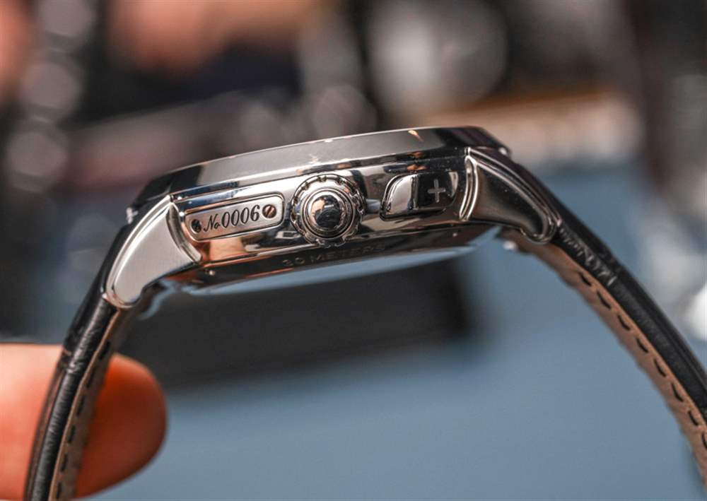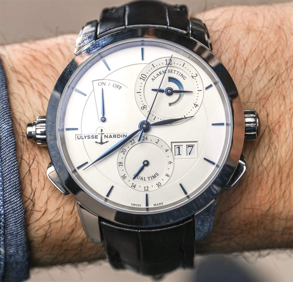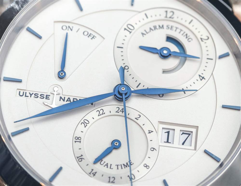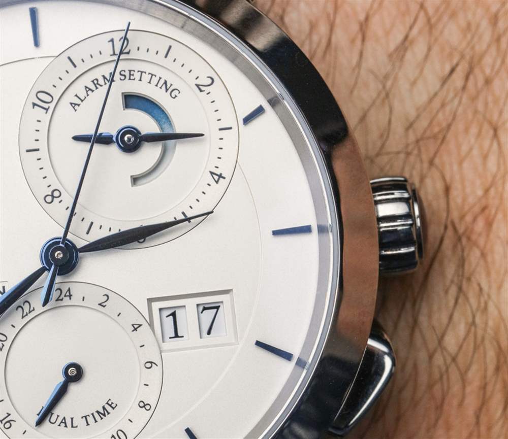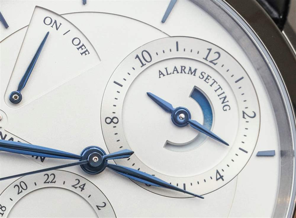 為了簡單地解釋復雜性,我會說它提供時間、一個大日期指示器、帶有專用“前進和后退”按鈕的雙時區,以及一個獨特的警報系統,它結合了傳統警報和一分鐘的提示音中繼器。請注意,鬧鈴設置轉盤中還有一個專用的動力儲備指示器,可讓您了解鬧鈴彈簧是否有電。所有這些都在平衡但不對稱的表盤上進行了相當合乎邏輯和吸引力的布局。廣告訊息廣告信息結束