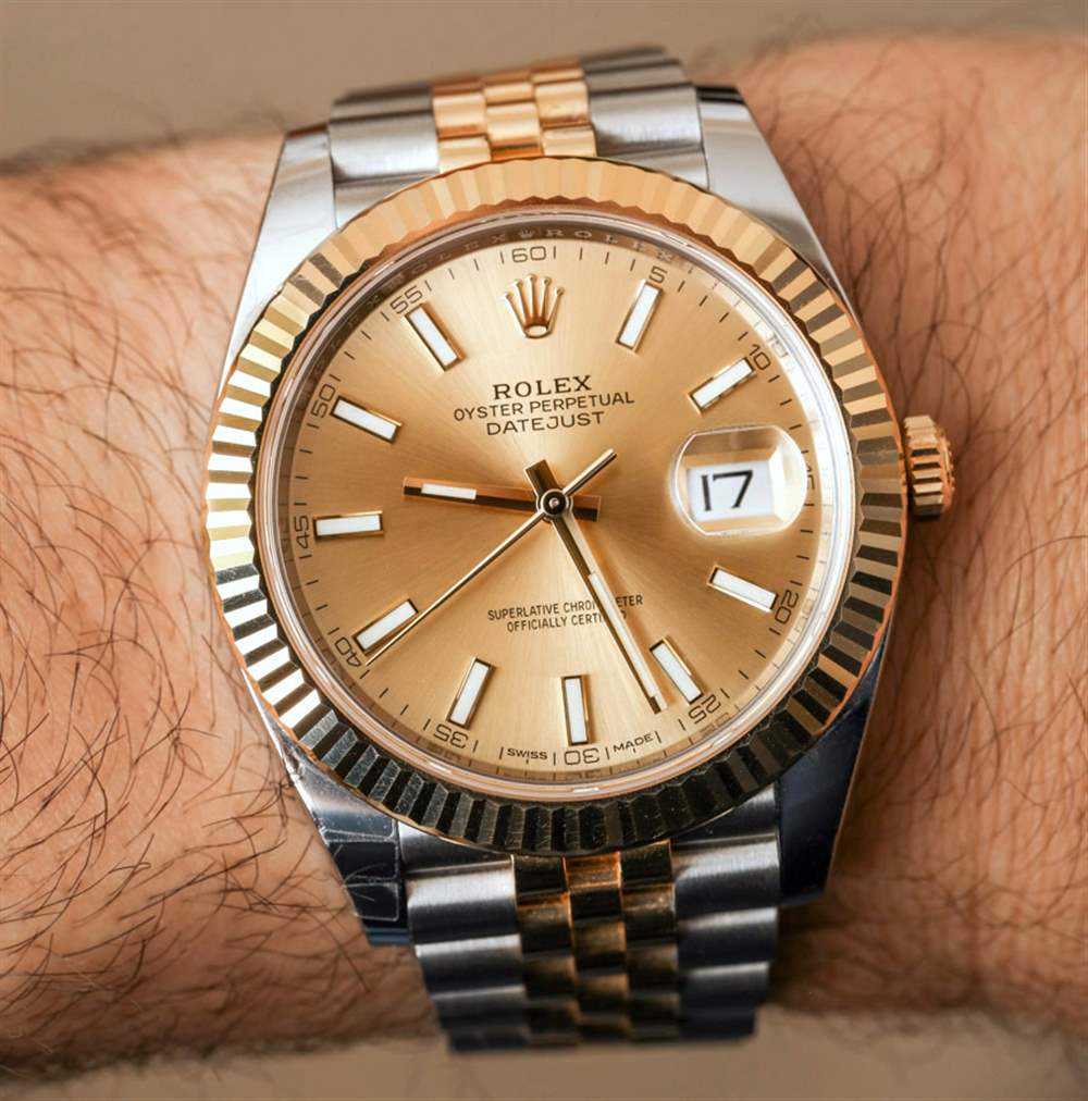 我選擇的那個實際上是勞力士用來在其網站上以及在 2016 年大部分時間在各種營銷材料中展示 Datejust 41 reference 126333 的“海報模型”。這個特殊的 Rolex Datejust 41 reference 126333 是 904L 鋼和 18k 黃金帶凹槽的 18k 黃金表圈和相配的“香檳”色表盤和易于閱讀的棒狀時標。它還使用了勞力士最新版本的廣受歡迎的 Jubilee 式手鏈,該手鏈利用了許多小鏈節。