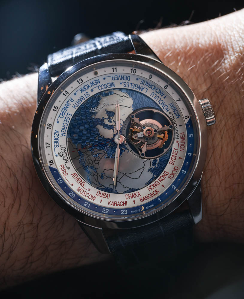 Jaeger-LeCoultre 聲稱在世界時間顯示盤中心的“地球表盤”上使用了扭索飾式機器雕刻來呈現海洋的外觀。它不是一個特別有用的表盤中心,但它在視覺上很有吸引力,這正是一些人認為的地球物理學,好吧,地球物理學。與此相同的其他 Geophysic 手表系列主題包括應用在表盤外圍的小發光點。