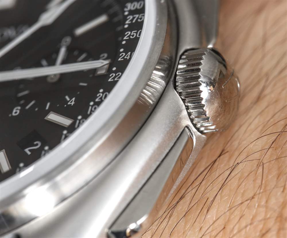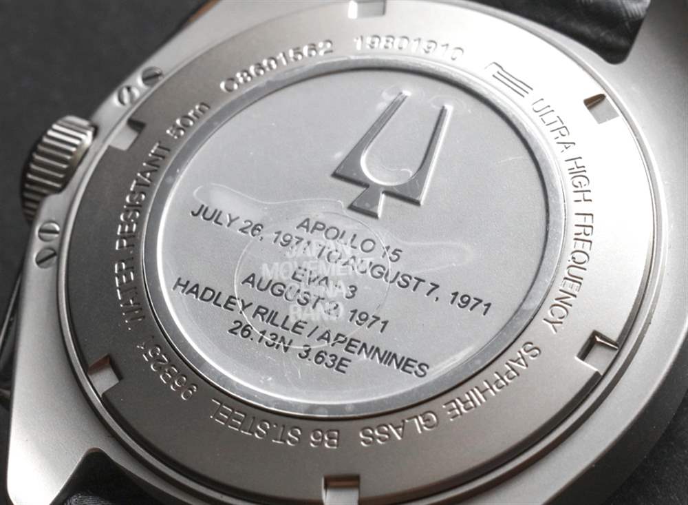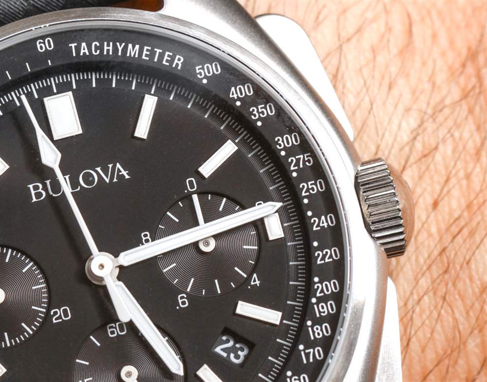 表盤周圍是一個帶有測速儀刻度的凸起 rehaut 環(huán),用于在距離參考點可見時測量速度。您很可能永遠不會使用測速儀刻度,它們作為過去的整潔痕跡繼續(xù)存在。凸起的測速刻度環(huán),以及表盤上的應用時標和凹陷秒刻度營造出非常受歡迎的深度感。平面表盤看起來很便宜,而在寶路華特別版月球計時手表中,幸運的是這不是問題。除了令人歡迎的面部三維視圖外,指針和時標的大小也非常合適且非常相稱。在我看來,這使整體表盤設計既實用又美觀。