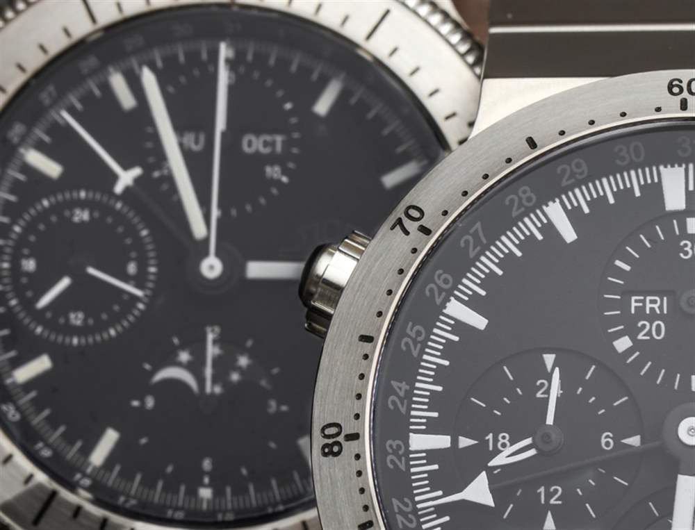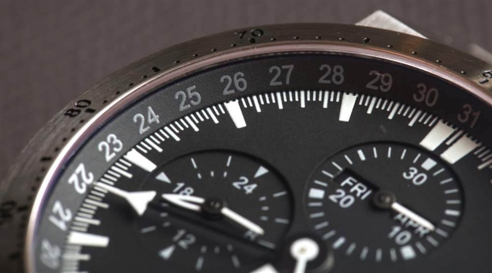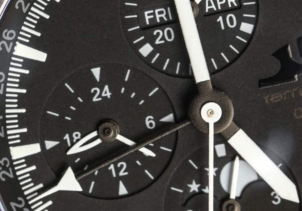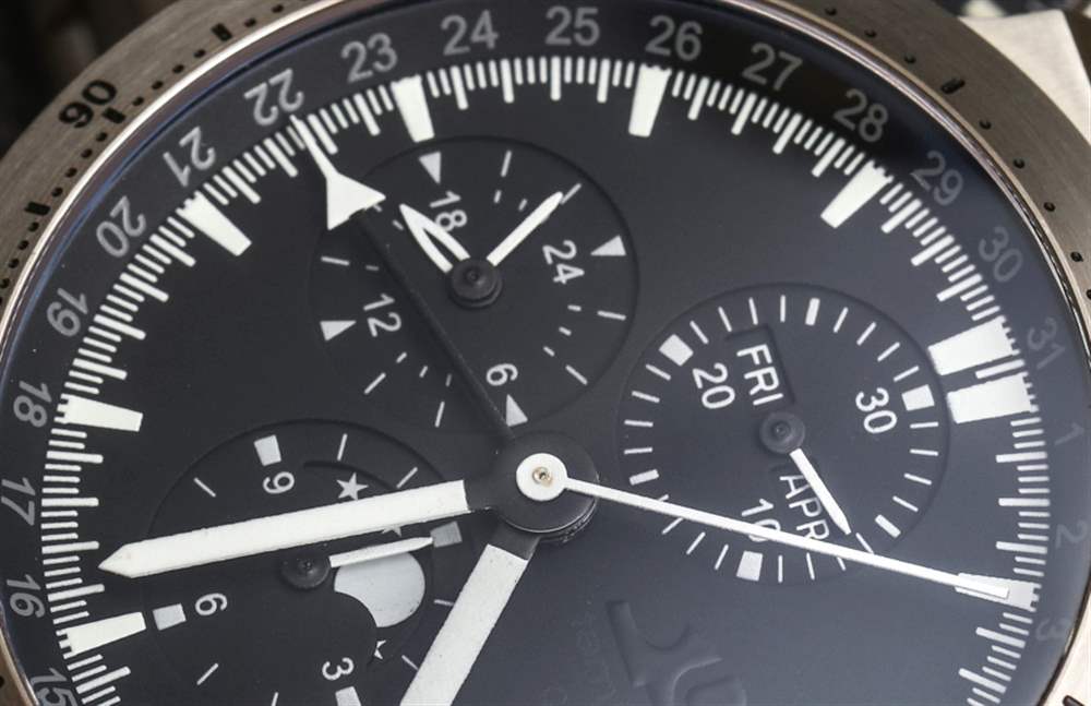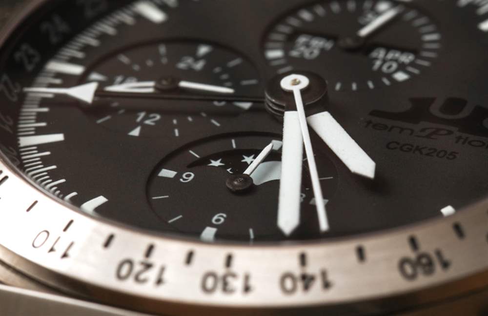 Valjoux 7751 自動(dòng)機(jī)芯本質(zhì)上是 7750,但增加了一些額外的復(fù)雜性。基礎(chǔ)機(jī)芯帶有 12 小時(shí)計(jì)時(shí)碼表,7751 型號(hào)增加了一個(gè)完整的日歷,帶有星期和月份窗口以及日期指針、帶 AM/PM 指示器的同步 24 小時(shí)指針和一個(gè)月相指示器。雖然完整的日歷不像年歷或萬(wàn)年歷那么花哨,但使用表冠和 10 點(diǎn)鐘位置的旋入式按鈕,可以在需要時(shí)相對(duì)輕松地調(diào)整日歷數(shù)據(jù)。