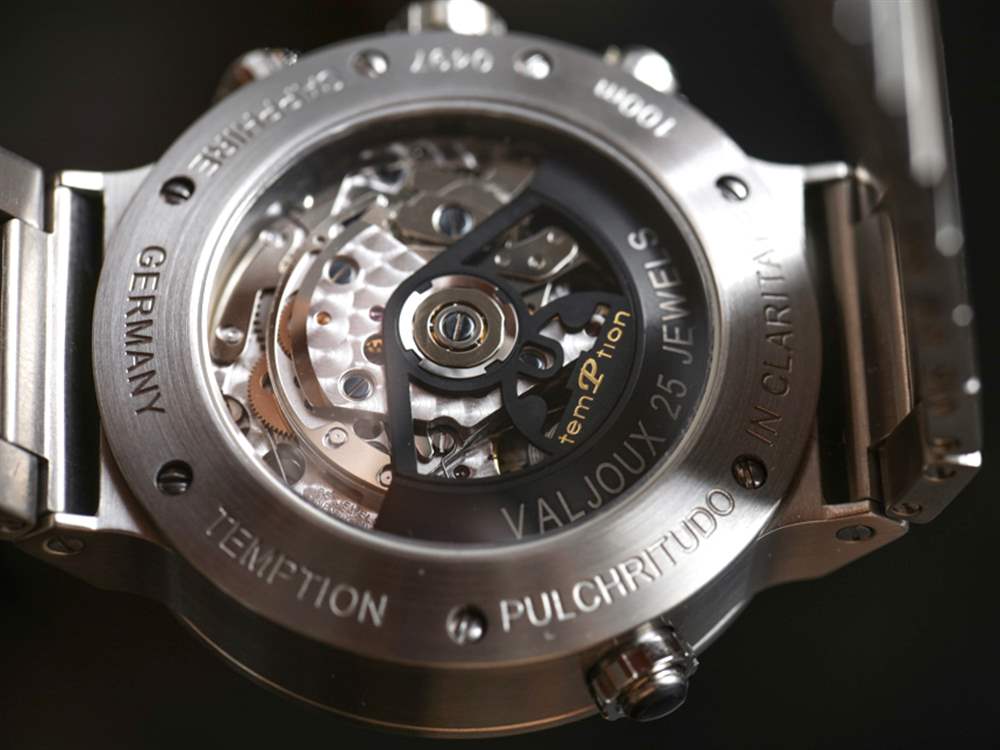 在評(píng)論視頻中,您可以看到我將 Temption CGK203 與此 CGK205 進(jìn)行了比較。主題和機(jī)芯是相同的,但在表殼、表盤、水晶和表鏈方面,它們是不同的手表。手表內(nèi)部是瑞士ETA Valjoux 7751自動(dòng)計(jì)時(shí)機(jī)芯。這種不太受歡迎的機(jī)芯功能齊全,但很難設(shè)計(jì)表盤。話雖如此,它的功能也很合理。Temption 還碰巧提供了 7751 的完整裝飾版本,其中包括許多漂亮的珍珠拋光和藍(lán)鋼螺絲。