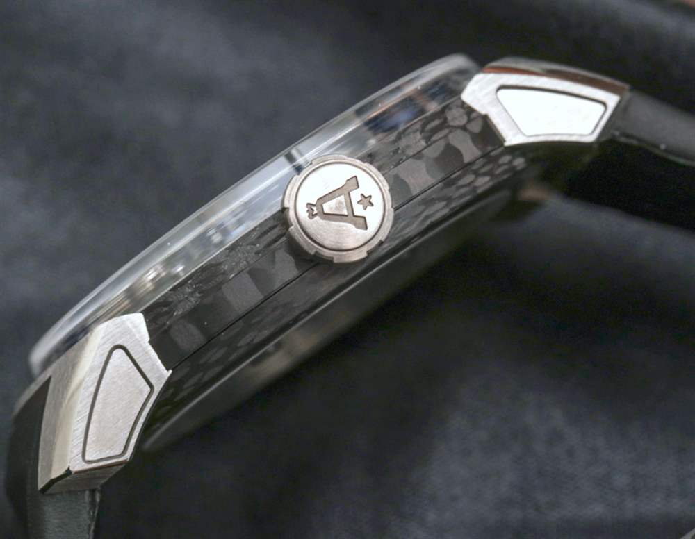 U20 表殼和 calibre A-250 機芯的重點是為機芯提供卓越的可視性。出于這個原因,Angelus決定稱它為“超骷髏”。首先是 42 毫米寬(僅 10.3 毫米厚)的表殼,其前后均使用“盒子式”圓頂藍寶石水晶。夾在中間的是黑色 NPT 碳纖維和鈦。防水深度為 30 米。這顯然是一個在美學和材料上都非常現(xiàn)代的設計。