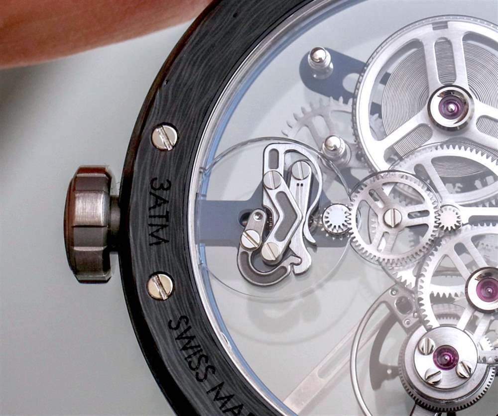 我最喜歡的是美學精致和專注于機械元素的結合,這些元素吸引了我們看書呆子的最深處。同樣,這一切都要感謝塞巴斯蒂安。Angelus U20 Ultra-Skeleton Tourbillon 旨在成為非常現(xiàn)代的陀飛輪應有的典范,同時為機芯提供卓越的可見性。我現(xiàn)在應該注意到,有兩個版本的手表可用——這個事實很容易被忽略。不同之處在于一個使用完全透明的藍寶石水晶底蓋,而另一個使用半透明的“單向鏡”式底蓋。