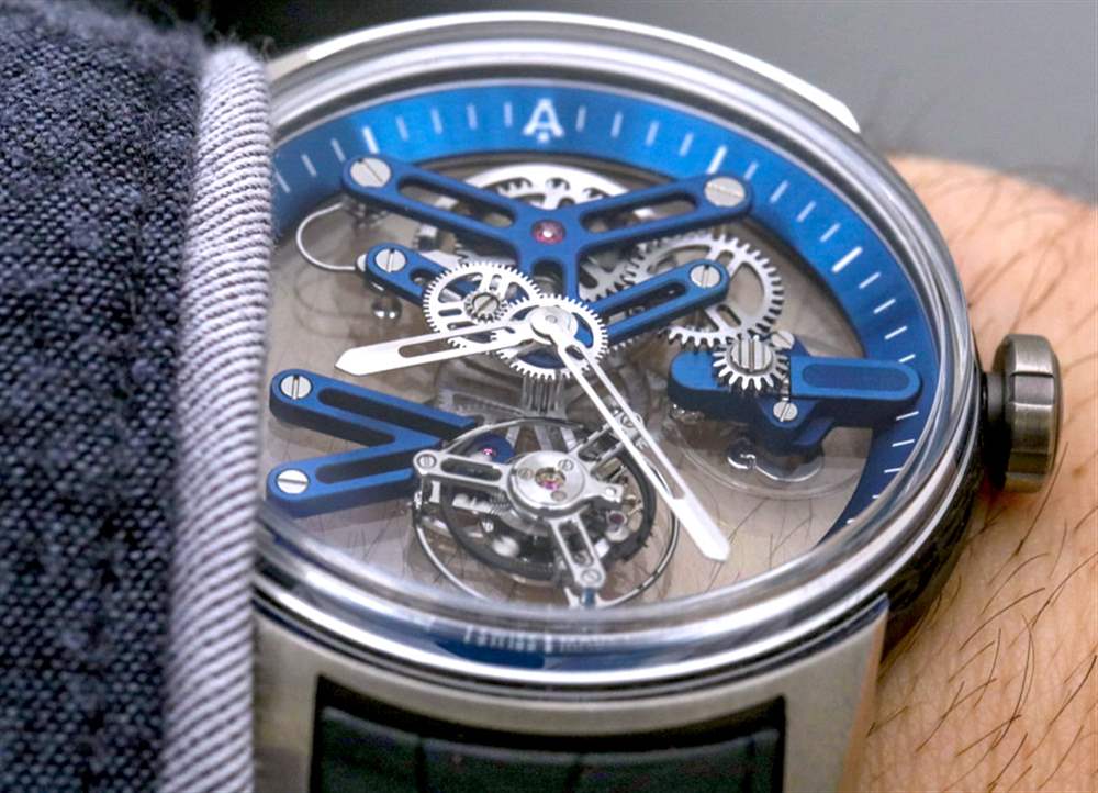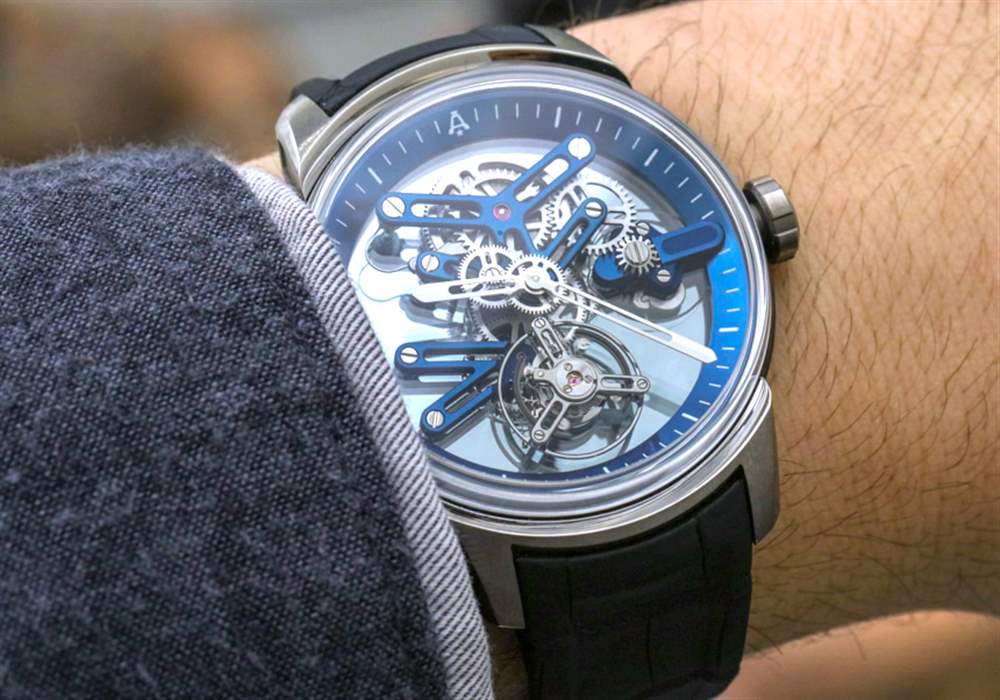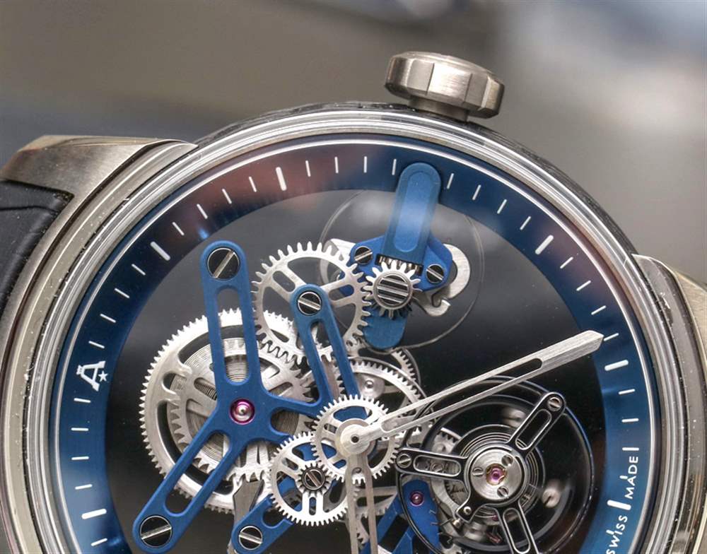 Angelus U20 Ultra-Skeleton Tourbillon 的 A-250 機芯(似乎幾乎不存在)是各種迷人的透明藍寶石水晶板,可將所有東西保持在一起,藍鈦橋板。其他材料,如鍍黃銅、鋼和金用于機芯的其余部分。從功能上講,機芯不僅指示時間,還包括飛行陀飛輪——因為“為什么不呢?”