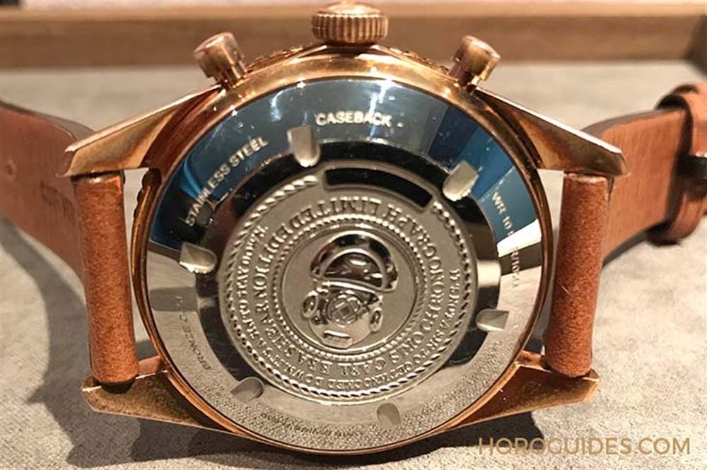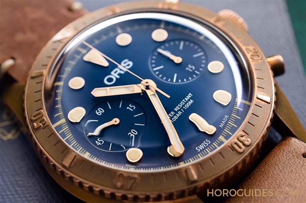 這次ORIS在上海正式發表品牌第二款青銅腕表,同樣是向Carl Brashear致敬,一樣的藍面與底蓋,放上他一生的名言:『被擊倒并非罪過,倒而不起才是罪過。』但功能再升級,搭載Oris Caliber 771機芯(以Sellita的SW510改制),更是第一次用于Oris腕表之中,并且采用的是“Bicompax”雙計時盤(雙眼)而非”Tricompax”三計時盤(三眼)的配置,同樣耐看,但與前一代相比,尺寸大了一點點從42mm到43mm,6點鐘位置也少了日期窗,12點鐘位置的品牌Logo下方也少了Automatic字樣,但好看還是不變的注解。