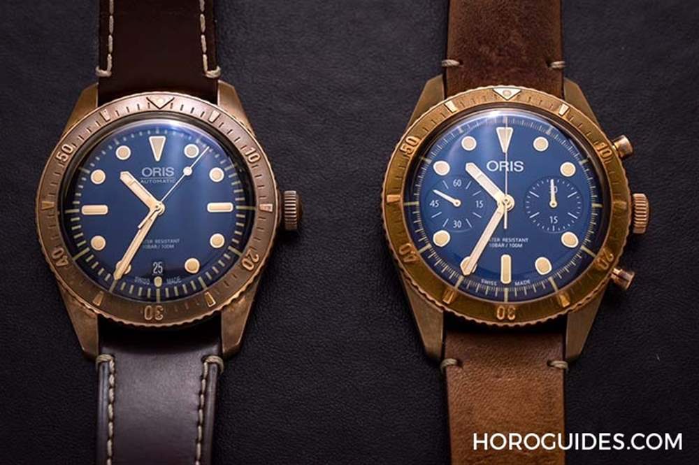 右為ORIS最新發表的青銅計時碼表,左為2016年推出的青銅腕表,同為Divers Sixty Five系列,限量2000只。最大的差別在于計時功能、日期窗與Automatic字樣有無、尺寸差1mm與表帶縫線。