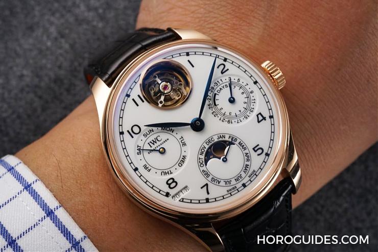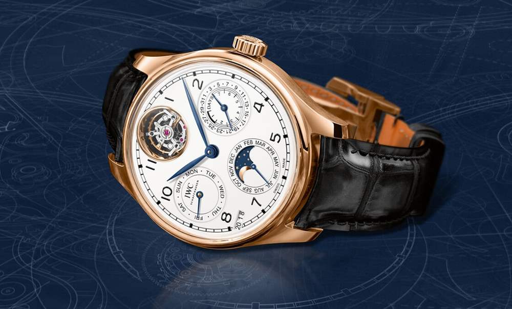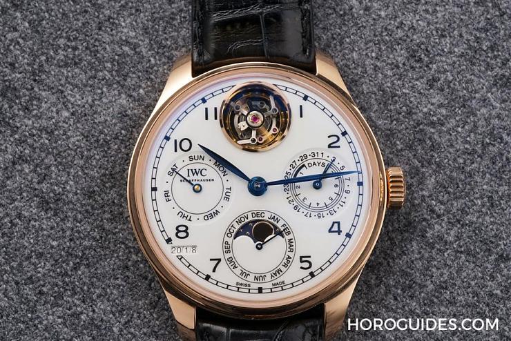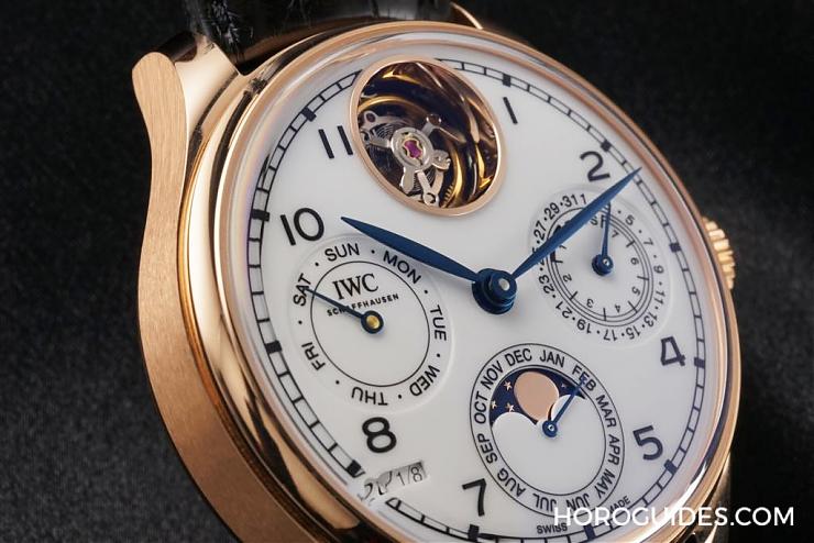 這款葡萄牙系列萬年歷陀飛輪腕表150周年特別版(型號IW504501),是IWC第一次推出同時具備陀飛輪與萬年歷功能的腕表,以1985年由Kurt Klaus所研發的Da Vinci達文西系列萬年歷腕表(IW3750)為啟發靈感,在12點鐘位置加上82枚零件組成、僅0.635克重的陀飛輪裝置,并將月相顯示并入6點鐘的月份盤內。