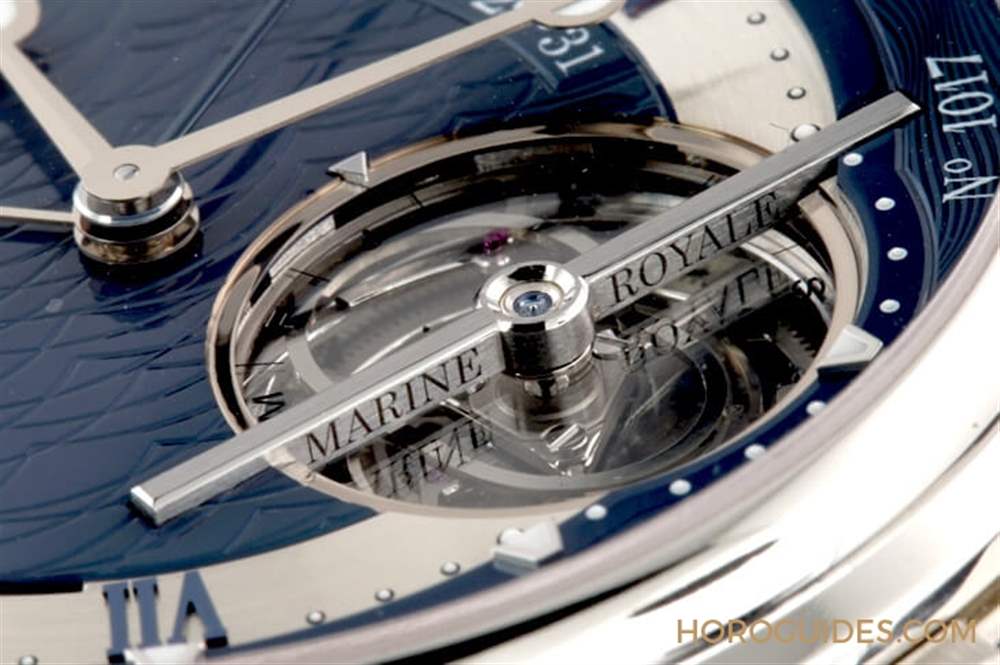 陀飛輪表橋側(cè)邊刻有”MARINE ROYALE”字樣,軸承為藍色的尖晶石。