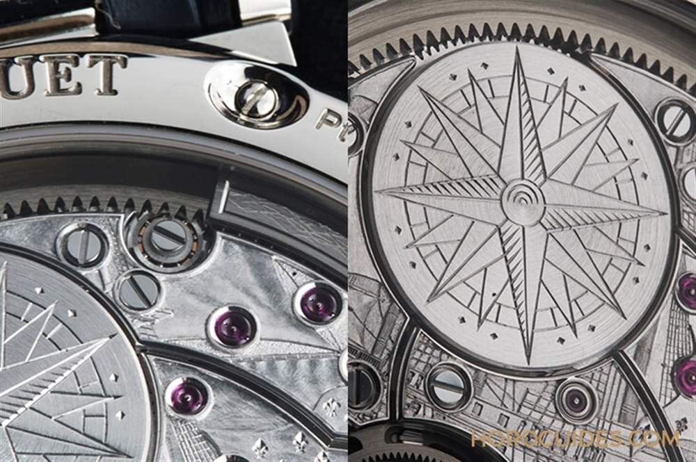 發(fā)條盒蓋上雕刻的是風(fēng)向玫瑰圖案的羅盤,發(fā)條盒邊緣看得到環(huán)型自動盤上鏈的輪齒。