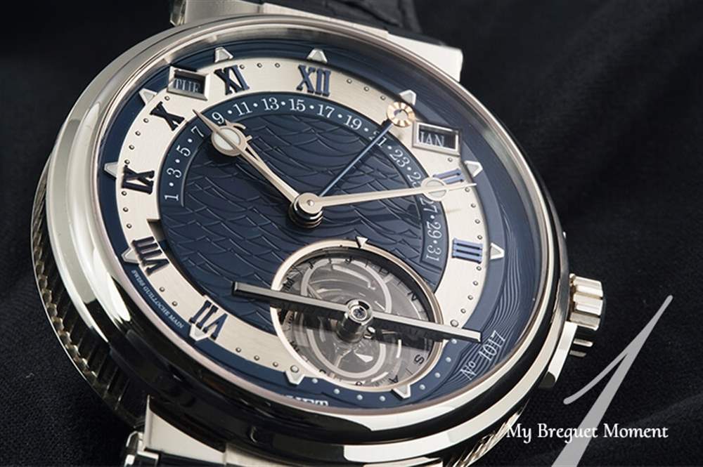 高級表重視的就是細(xì)節(jié),每一處零件都經(jīng)過精心的打磨、鐫刻,而寶璣絕對是這方面的專家。5887表盤特殊的手工鐫刻,是專門為這只表設(shè)計(jì)的波狀紋理,搭配藍(lán)色的金質(zhì)表盤相當(dāng)呼應(yīng)表款的航海淵源。表盤上各區(qū)塊也各有不同的裝飾細(xì)節(jié),羅馬數(shù)字時(shí)標(biāo)圈是霧面拉絲打磨,表盤最外圍則還有波浪狀的雕飾。