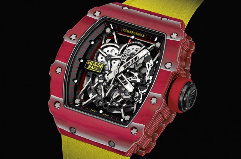 RM35-02的特別之處,是Richard Mille為拿度身訂造的表款,可以承受巨大的沖擊力之余,亦由于用上了NTPT的超輕物料,可以配上極搶眼的黃色表帶,價錢約在104萬港元,但是卻是全球都在搶的腕表!