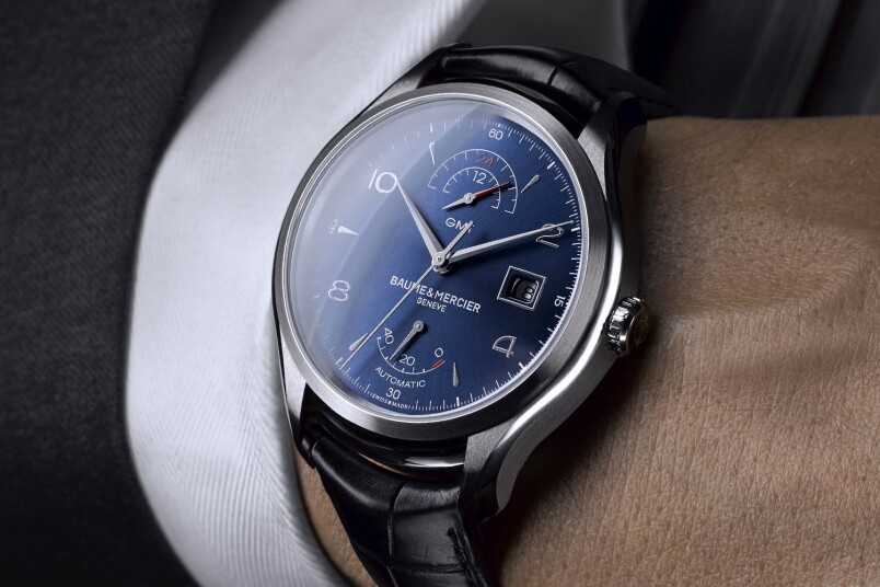 除了Oris那一款可以睇到兩地時間,Baume Mercier的這款Clifton GMT Power Reserve都一樣可以,這一款腕表我在表展一見已經愛上,皆因其在光線下會不停變化的太陽緞面深藍表盤,襯在43mm的拋光緞面打磨精鋼表之上,好看又易襯,典雅亦成熟。而上面有齊大量功能,包括日期、動力儲存與雙時區顯示,第二時區顯示設在12點鐘位置,兼有日夜顥示,而動力儲存顯示設在6點鐘位置,聰明在上下都使用半月形的設計,令表盤有一種平衡的美,而且加上那一點紅都是一醒目的設計,易讀又好看!