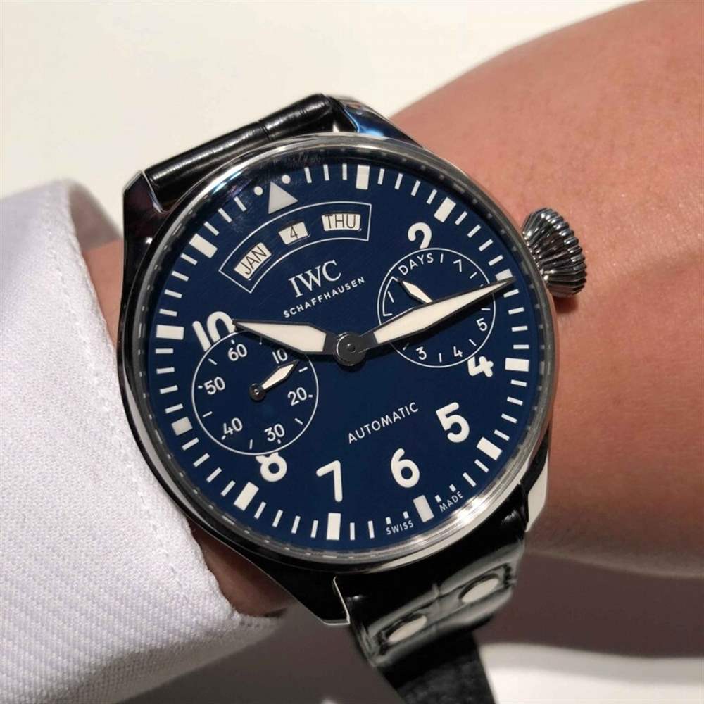 IWC Big Pilot’s Annual Calendar(IW502708) 是IWC整個(gè)150周年系列之中,唯一一款年歷款式,年歷的特別之處,是可以一整年只需調(diào)整一次日期,就是在二月的時(shí)候,在其余的月份都可以自動調(diào)節(jié)30日或是31日。其藍(lán)色漆面表盤以美式格式分別顯示月份、日期以及星期,一眼睇曬非常方便。我最喜歡其漆面表盤,其實(shí)整個(gè)系列的漆面表盤都是用上12層涂漆,令表面更光滑圓潤,反光與金屬表盤并不一樣,有一種工藝品的溫暖感。特別是藍(lán)色的漆面,更有一種優(yōu)雅的感覺。