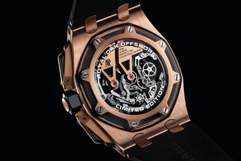 如果要形容這全新的Royal Oak Offshore Tourbillon Chronograph,我會形容為充滿未來感及建筑結(jié)構(gòu)感,看進去表盤的設(shè)計,你可以感到猶如一座未來建筑的微縮結(jié)構(gòu)似的。必須留意的是,AP經(jīng)典的八角鏍絲仍然都在,但卻放在藍寶石玻璃之下,不再只是為了固定表圈而設(shè),卻是直透機芯,將機芯部件固定,將結(jié)構(gòu)從表面一直延伸至心臟,與其他的Royal Oak Offshore大有不同!