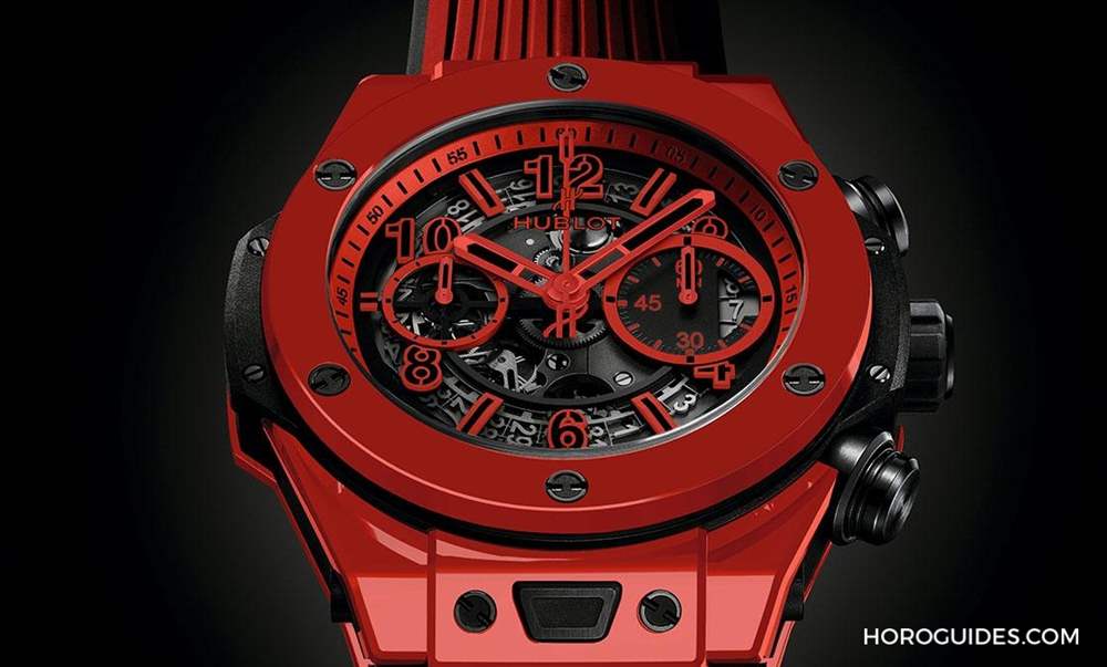 BIG BANG UNICO RED MAGIC表徑45mm,搭配自制HUB1242 UNICO自動上鏈飛返計時導柱輪機芯,表殼與表冠皆由宇舶專利魔力紅陶瓷所打造,限量500只。
