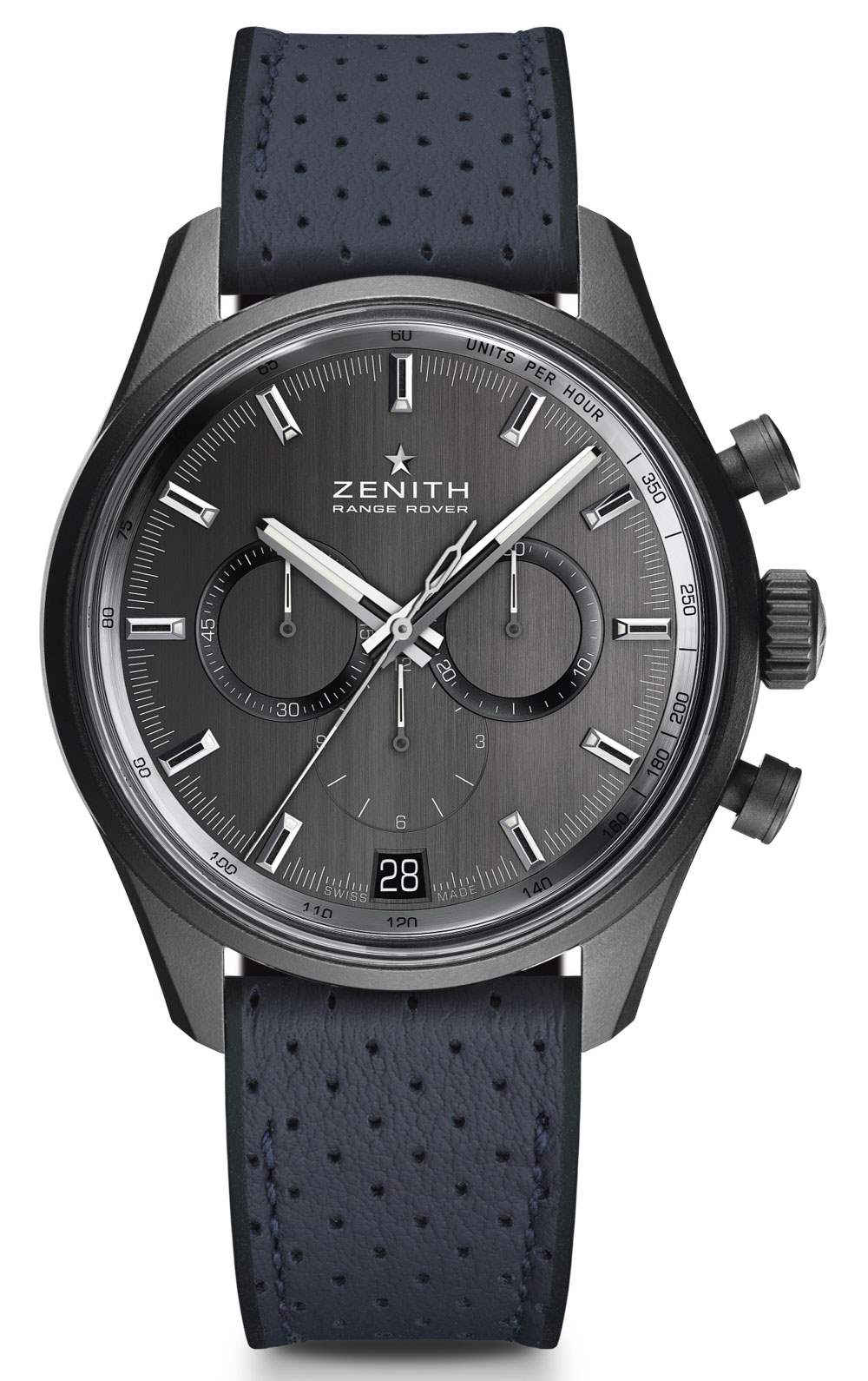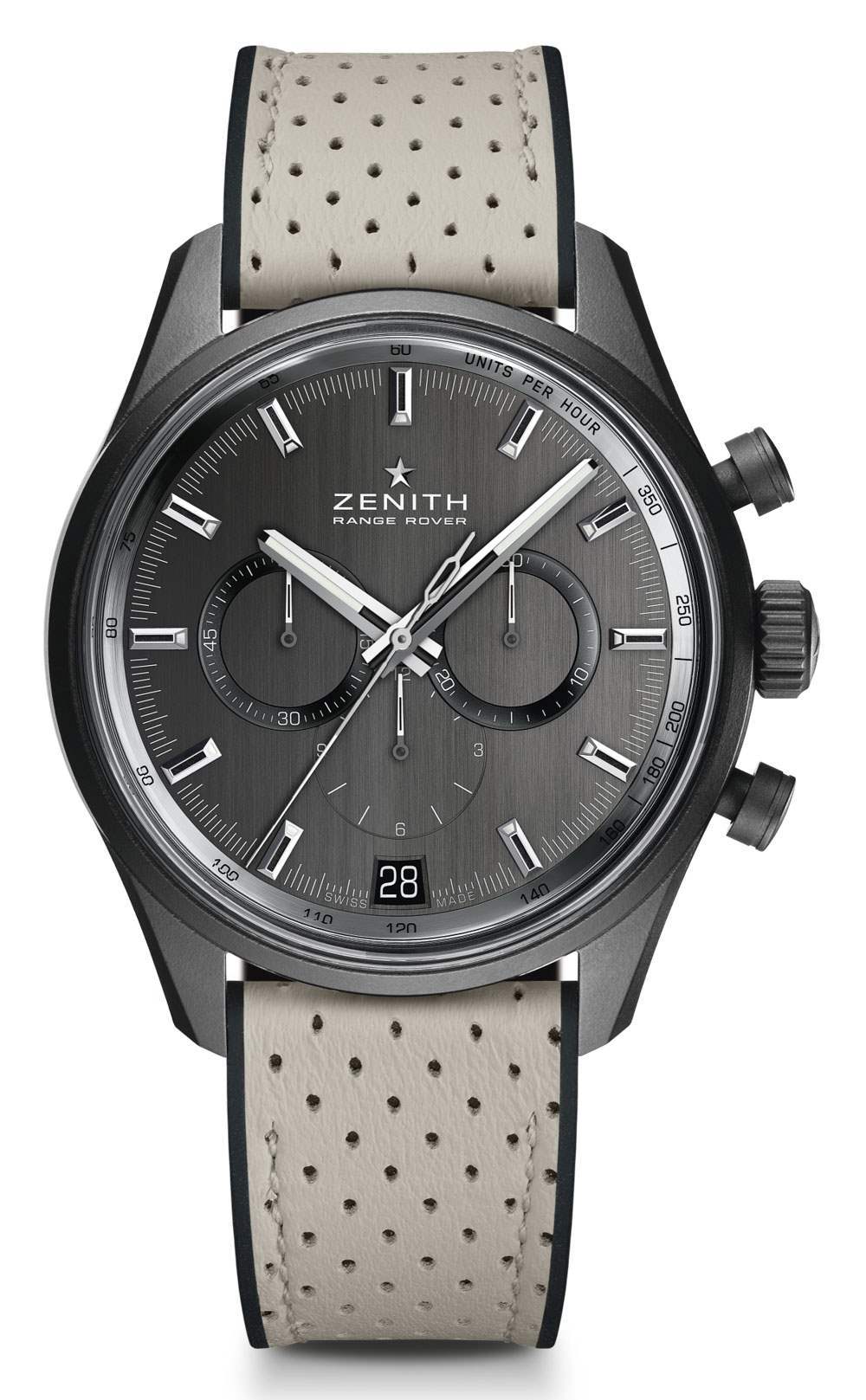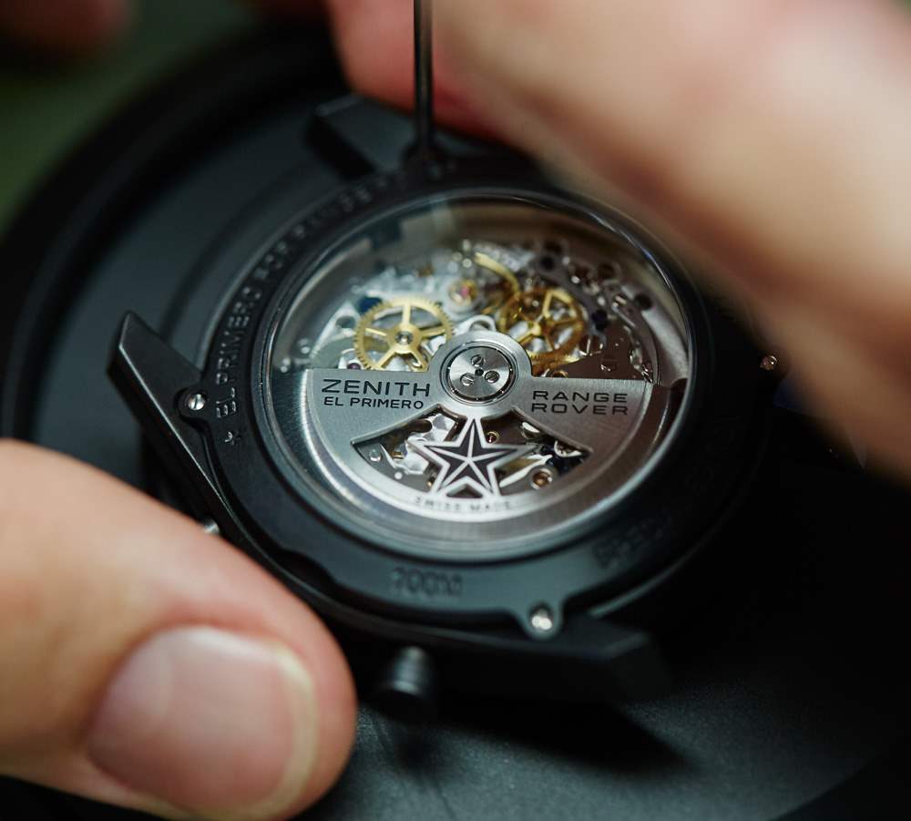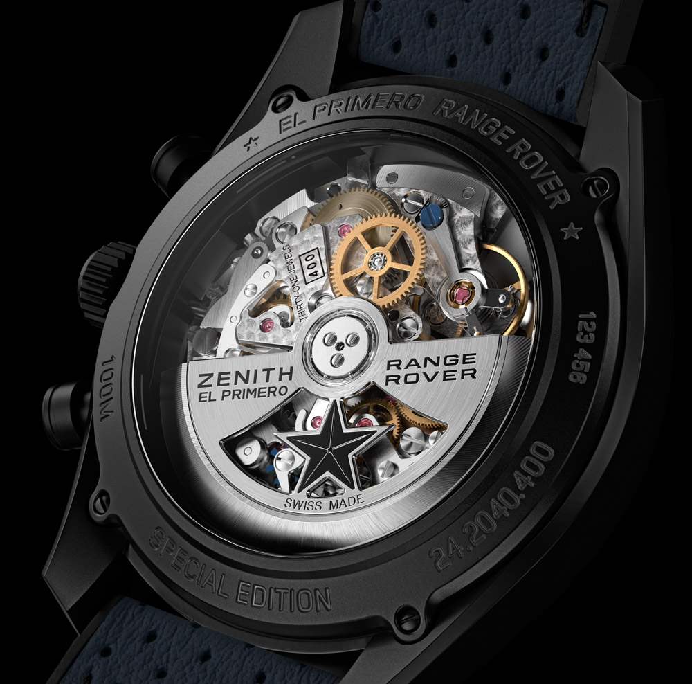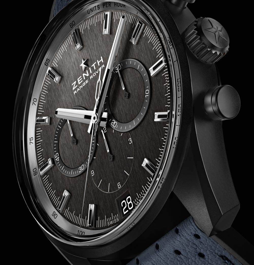 Zenith El Primero Range Rover 特別版腕表采用“陶瓷化”(我在想黑色陶瓷涂層——實(shí)際上就是這樣)磨砂鋁制表殼,寬 42 毫米,佩戴在手腕上應(yīng)該很輕。真力時(shí)評(píng)論說(shuō),鋁制表殼材料是對(duì)路虎攬勝底盤(pán)材料的一種認(rèn)可。鋁在高端表殼中很少見(jiàn),因?yàn)殡m然它很輕,但通常很脆弱。因此,我很想看看這款陶瓷鋁制表殼的親身感受如何——如果成功,它可以讓這款手表吸引那些甚至不關(guān)心路虎攬勝關(guān)系的人。