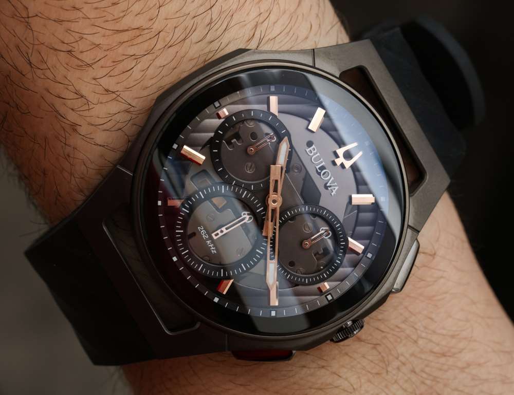 Bulova 所做的有趣的事情是從一開始就發(fā)布了外觀非常現(xiàn)代和更“保守”的 Bulova CURV 手表。正如我所提到的,“98A16”型號(hào)是最現(xiàn)代的,然后是外觀更經(jīng)典的“正裝”型號(hào),在 45 毫米寬的精鋼表殼(有些是黃色或玫瑰色)的表帶或表鏈上有五個(gè)版本金色調(diào))。這些傳統(tǒng)陽(yáng)剛但有些正式的 Bulova CURV 手表采用 45 毫米寬(9.7 毫米厚)表殼,參考型號(hào)為 97A124(699 美元)玫瑰金色調(diào)配鱷魚紋棕色皮革表帶,98A186(750 美元)精鋼表鏈搭配黑色表盤, 98A159(799 美元)雙色精鋼和黃金手鏈,98A160(799 美元)) 的雙色鋼和玫瑰金色表鏈,以及 97A125(799 美元)的全黃金表鏈表帶搭配表盤。