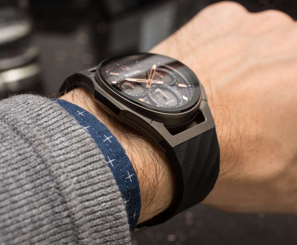 那些想要“充分”體驗(yàn) Bulova CURV 手表體驗(yàn)的人可能會(huì)喜歡這兩款更具“技術(shù)外觀”的型號(hào),分別是鋼和鈦的參考型號(hào) 98A161(799 美元)和 98A162(899 美元),以及最現(xiàn)代的型號(hào)-外觀 Bulova CURV 系列。這些型號(hào)采用更長(zhǎng)的表耳,采用 44 毫米寬(9.7 毫米厚)的表殼和附帶的黑色 EPDM 橡膠表帶。這些是唯一帶有展覽底蓋的型號(hào),它們也有半鏤空表盤。這些實(shí)際上是“中型”Bulova CURV 選項(xiàng),因?yàn)?Bulova 也有 43 毫米寬的型號(hào)和 45 米寬的 CURV 型號(hào)——盡管其他型號(hào)的佩戴方式大不相同,因?yàn)樗鼈兙哂胁煌谋須ず透鼈鹘y(tǒng)的表耳結(jié)構(gòu)。