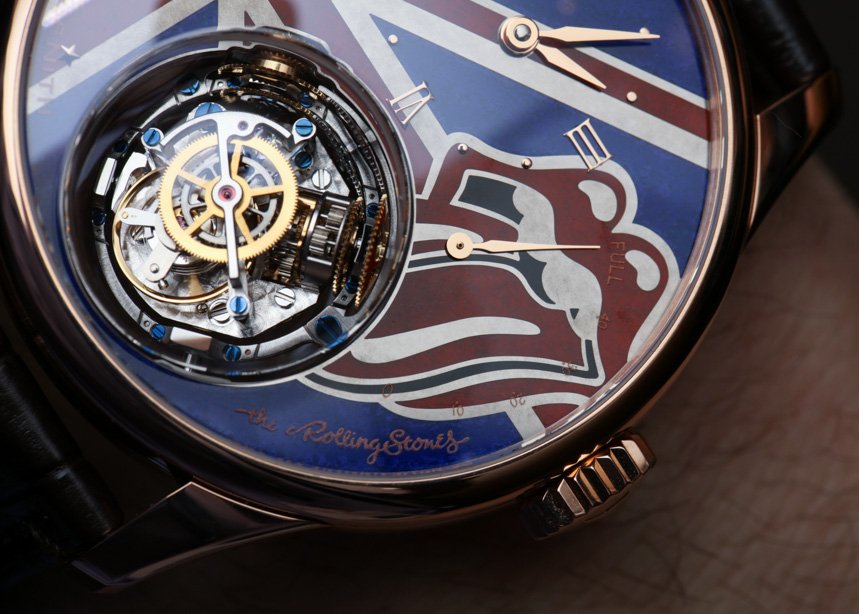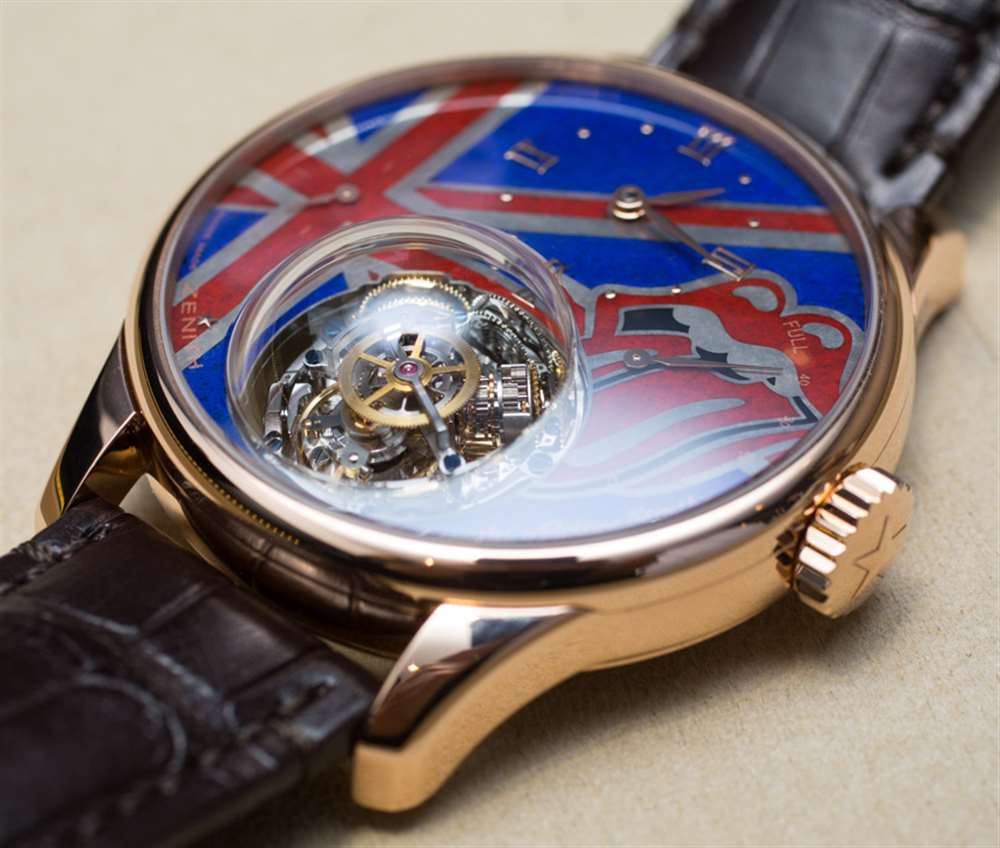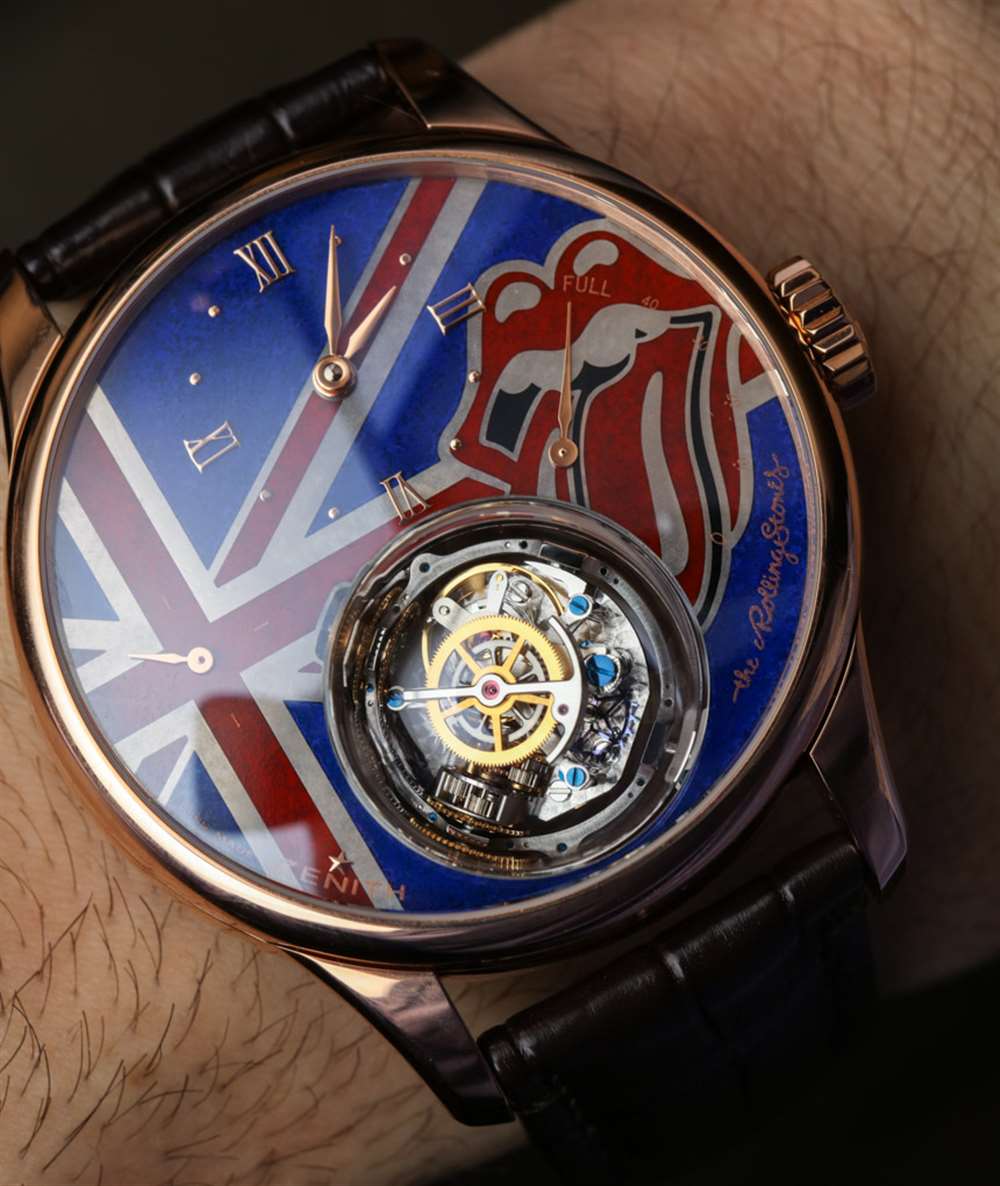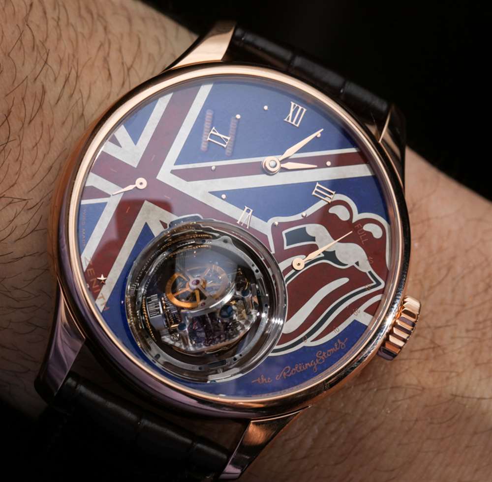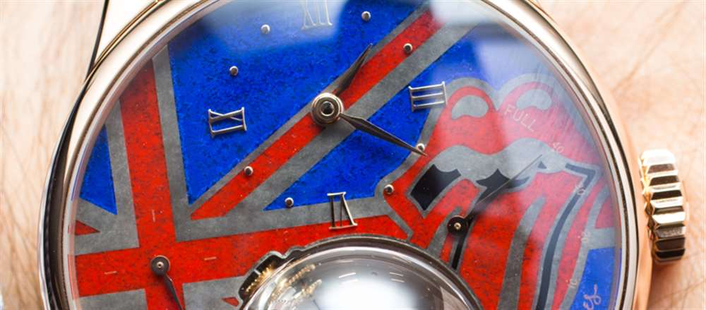帶有滾石樂(lè)隊(duì)的標(biāo)志、張開(kāi)嘴巴的標(biāo)志和英國(guó)國(guó)旗,每個(gè)表盤都是手工琺瑯,在指針和索引標(biāo)記上涂有金色貼花。如果您真的很喜歡滾石樂(lè)隊(duì),那肯定是一個(gè)很酷的概念。