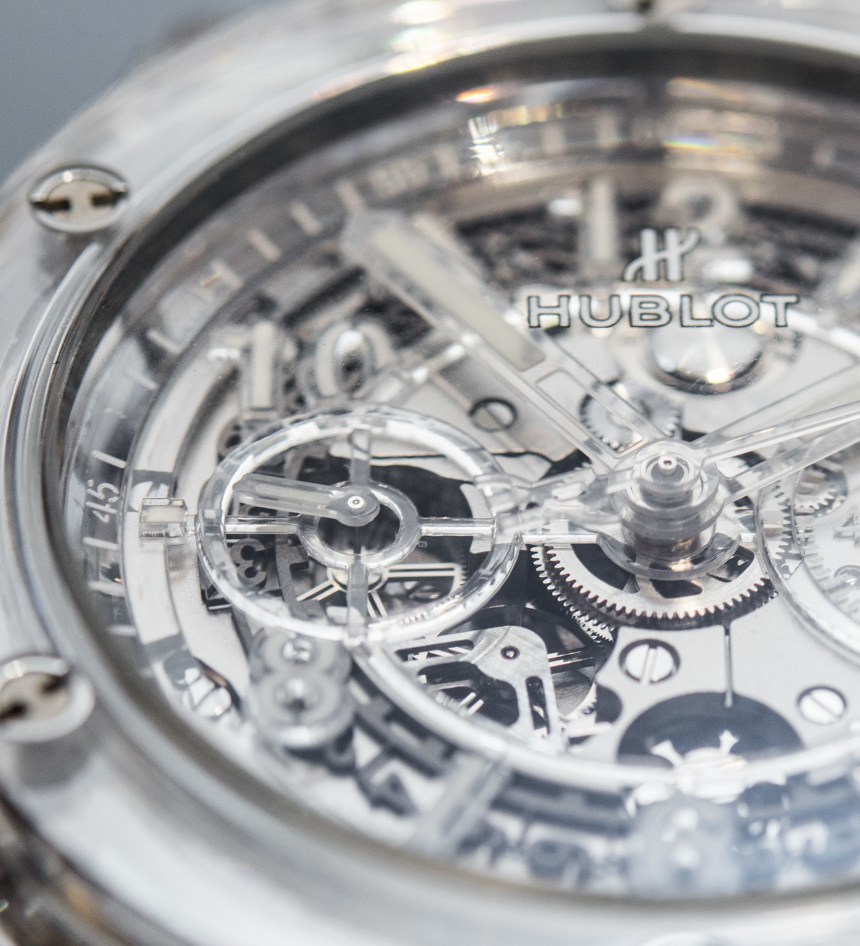 這有助于解釋為什么 Hublot Big Bang UNICO 藍寶石不僅擁有全藍寶石水晶三件式表殼,而且表盤上還有指針甚至表帶等透明元素。我不認為“透明”會成為新的“全黑”,但這是一個很酷的概念,而且無可否認,它非常適合 Big Bang UNICO。