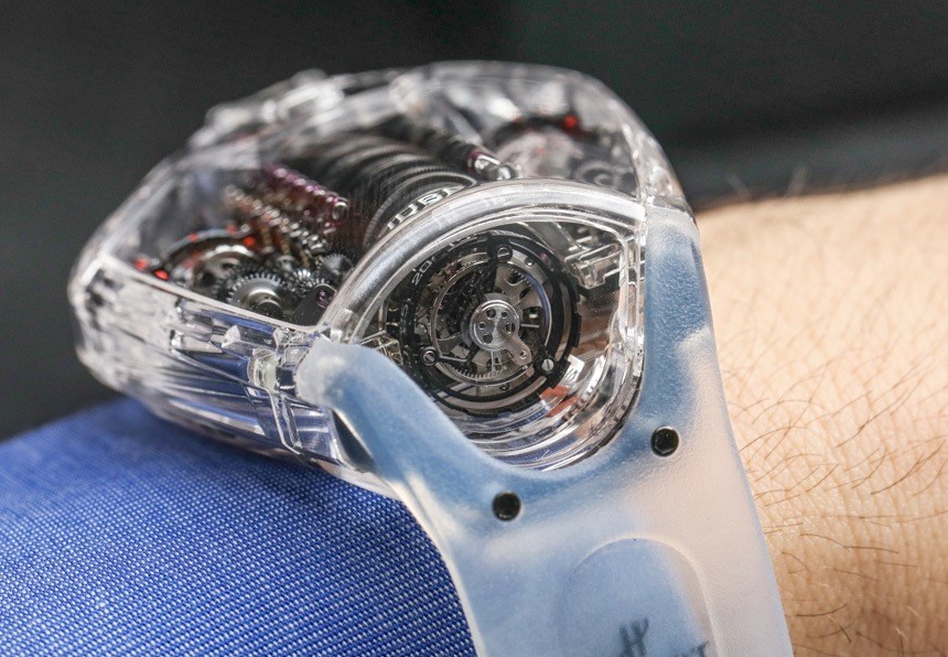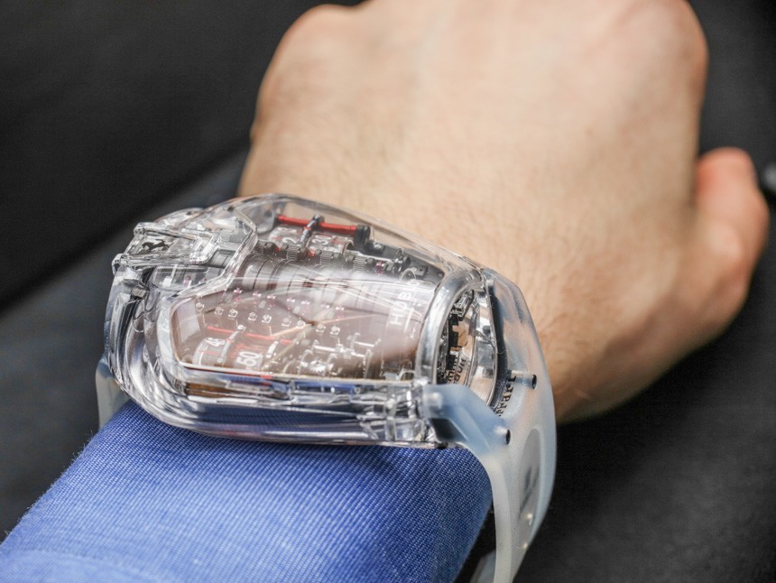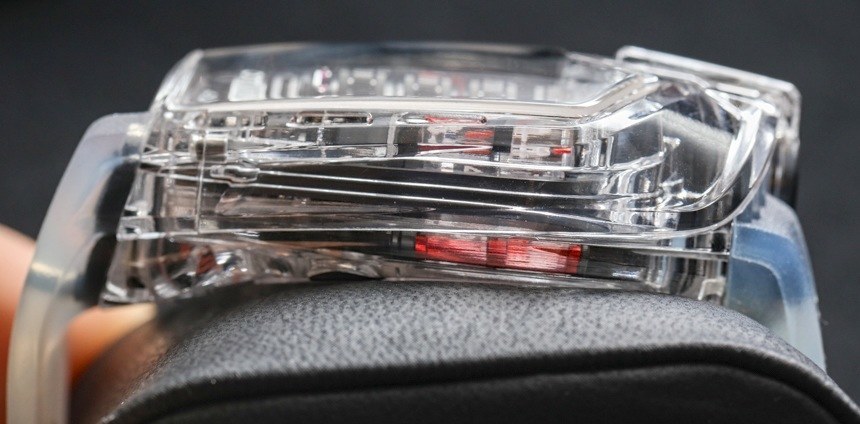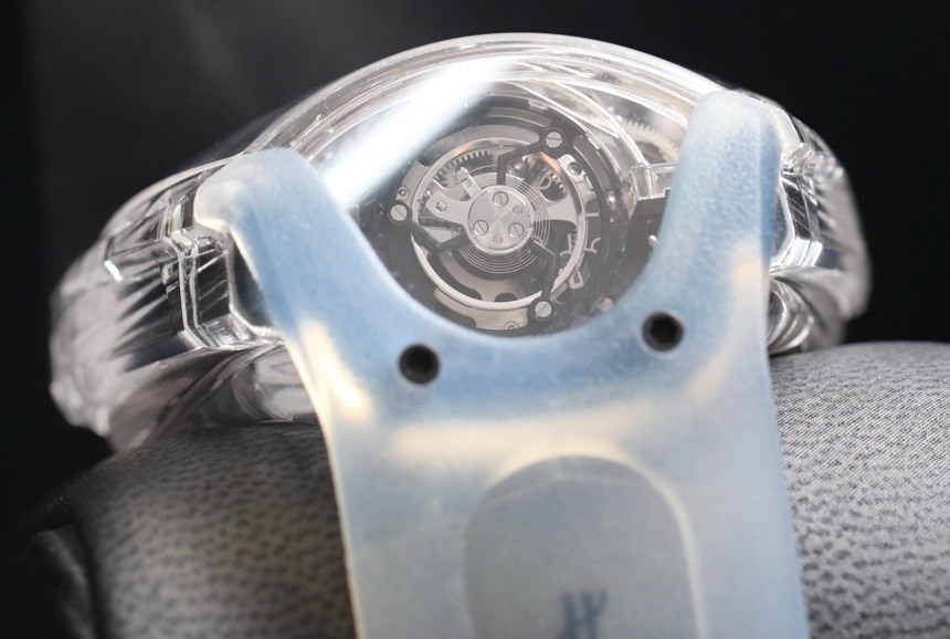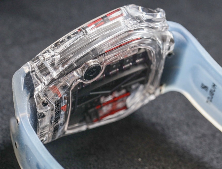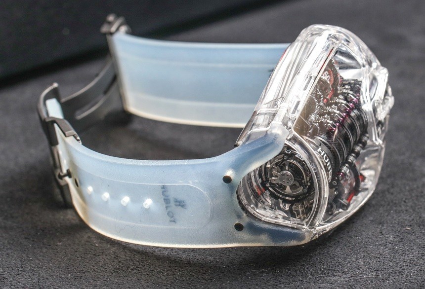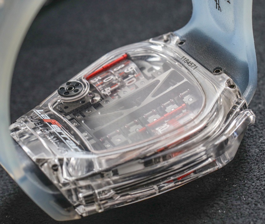 手表制造商對藍(lán)寶石水晶手表所做的最奇怪的事情之一就是將“透明”主題帶入表帶。對于這個(gè)型號(hào),Hublot 擁有我認(rèn)為是幾乎透明的“磨砂”硅膠表帶和鈦扣。這很有趣,但我有一種感覺,這款手表的主人會(huì)想要將表帶換成更時(shí)尚的東西,因?yàn)樗{(lán)寶石水晶表殼的透明主題本身就足夠了,而無需延伸到表帶。毫無疑問,Hublot 已經(jīng)想到了這一點(diǎn),而 Hublot MP-05 LaFerrari Sapphire 可能至少配備了另一種表帶選項(xiàng)。